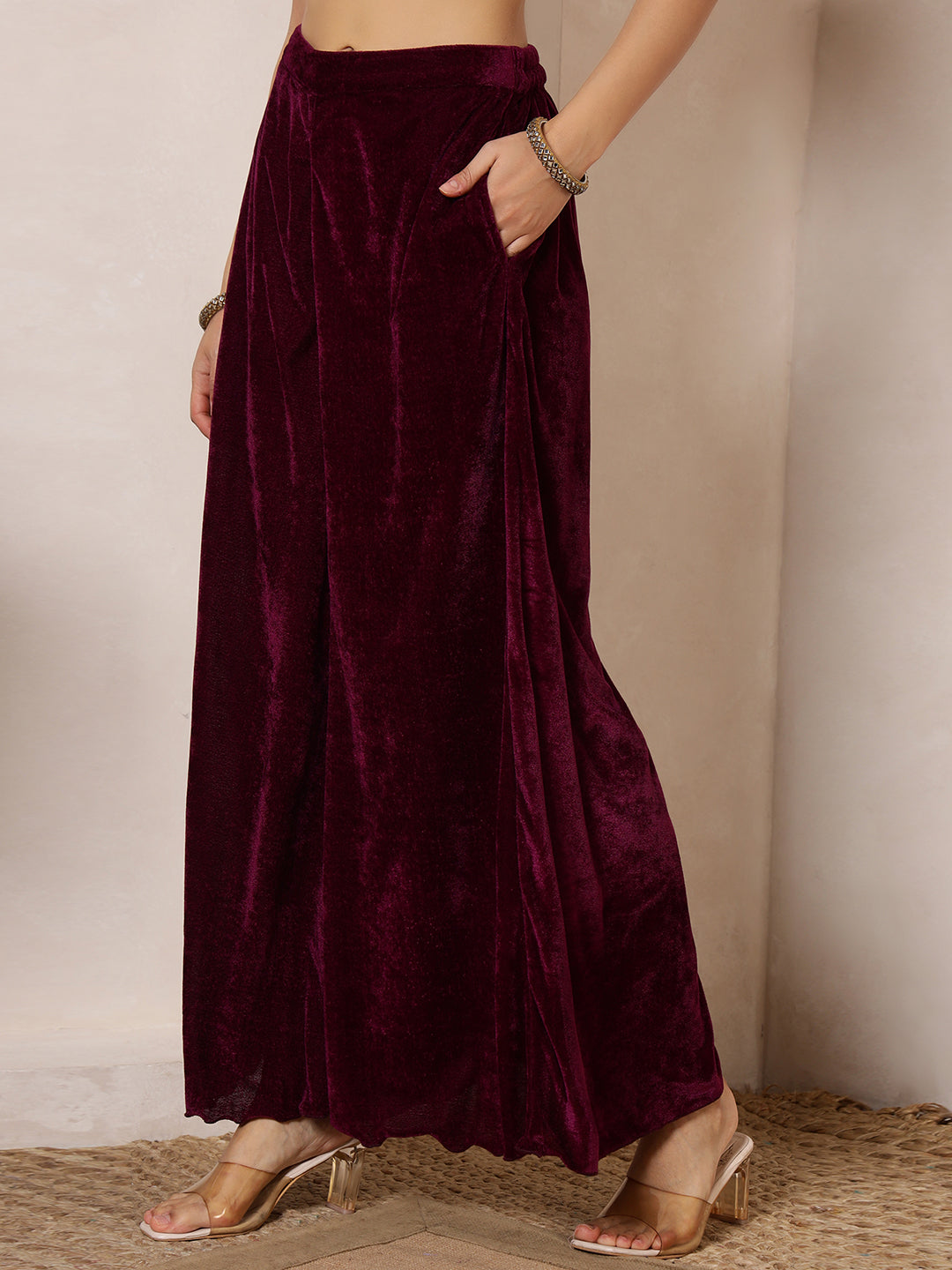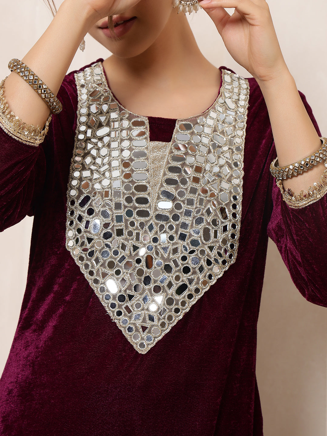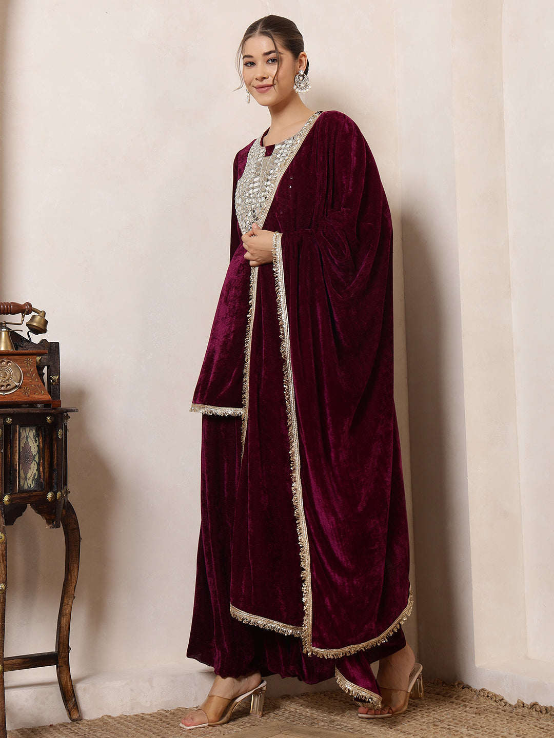 Velvet Wine Kurti Embroidered Neck Patch Sharara With Dupatta Indo Western Women Co-Ord Set