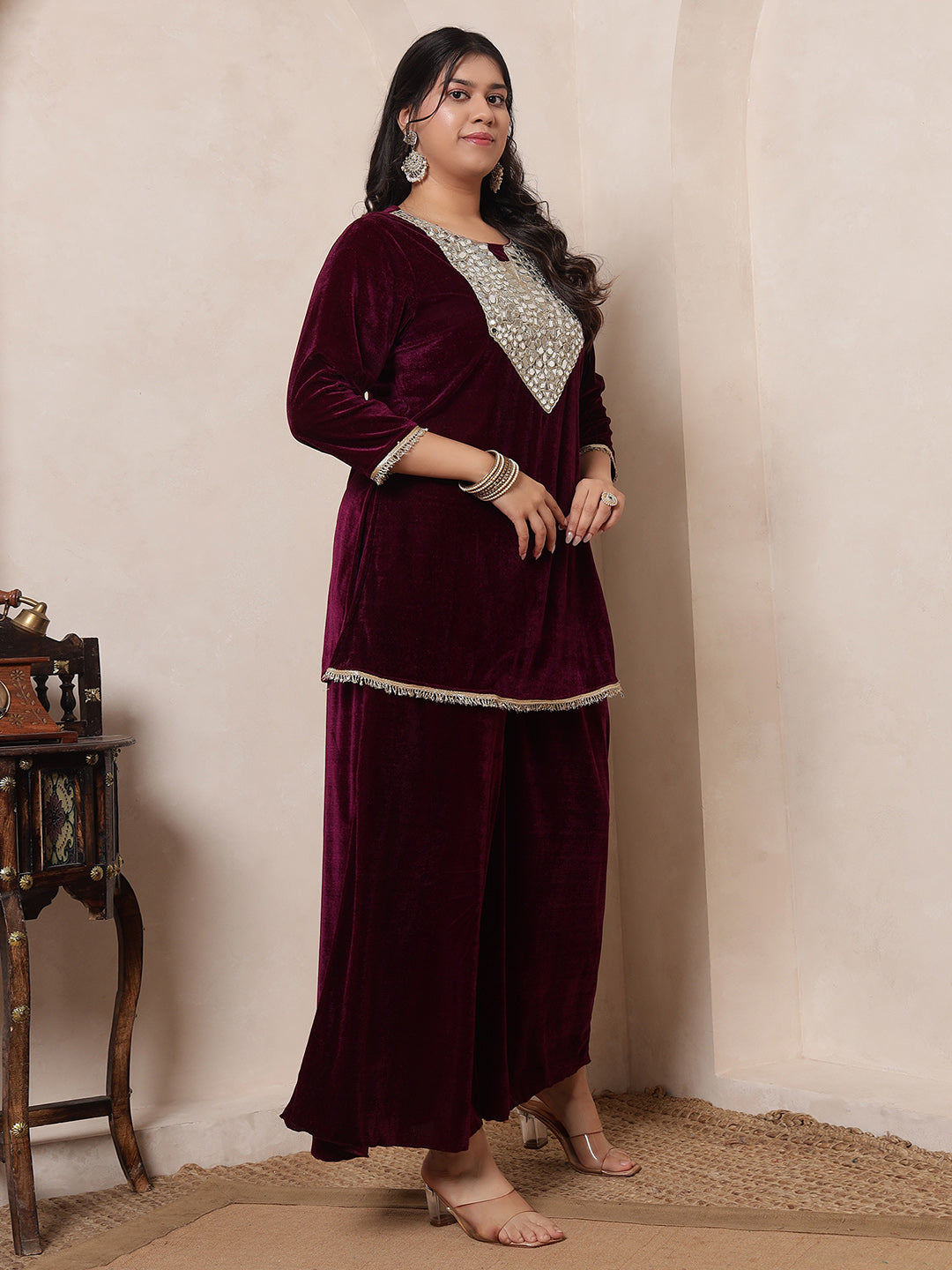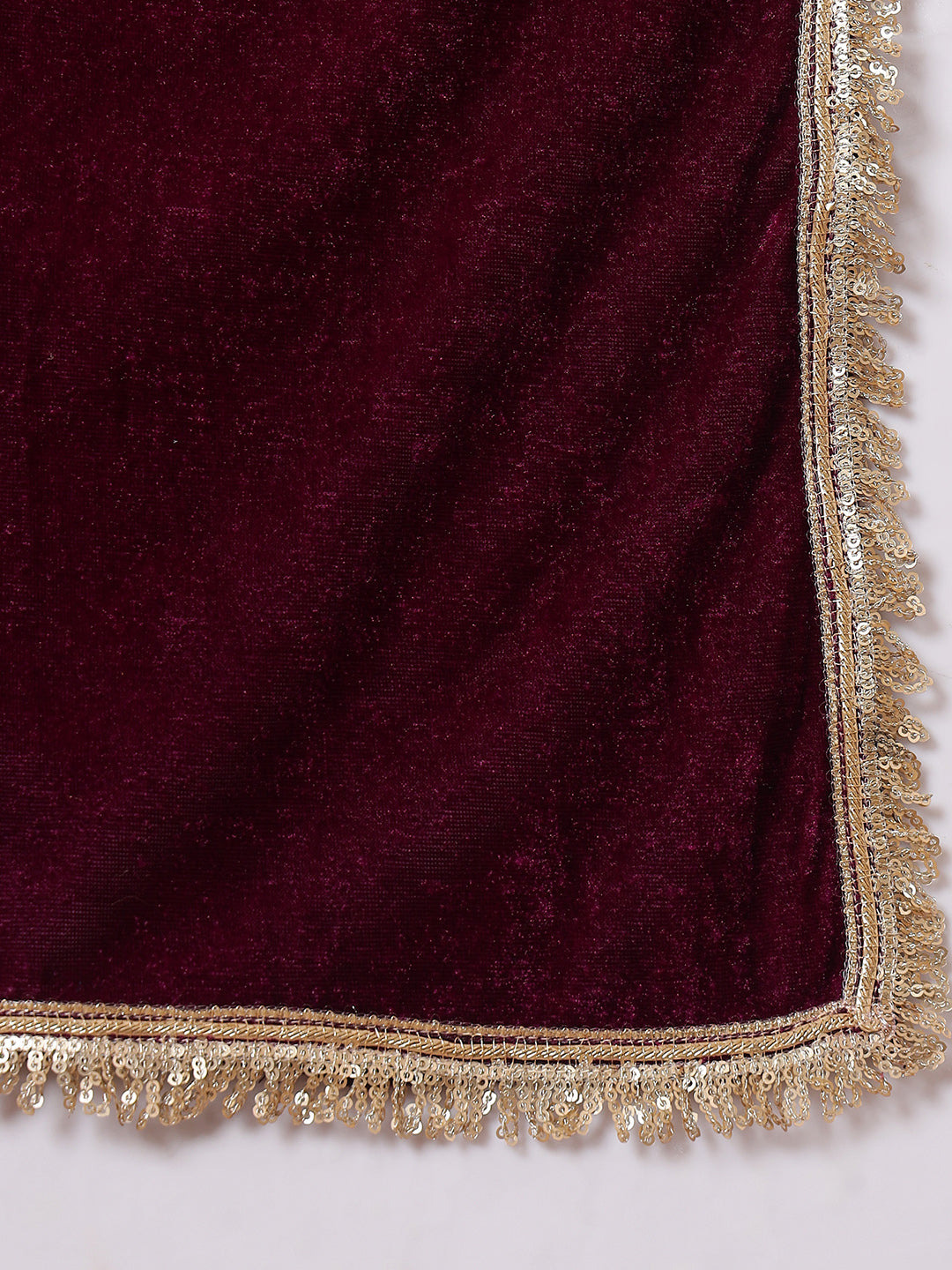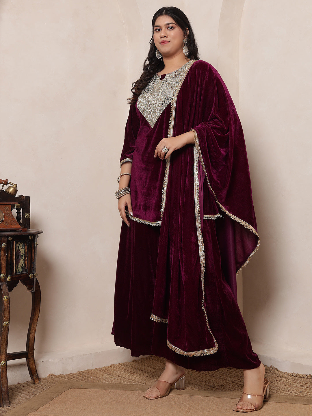 Velvet Wine Kurti Embroidered Neck Patch Sharara With Dupatta Women Indo Western Women Co-Ord Set