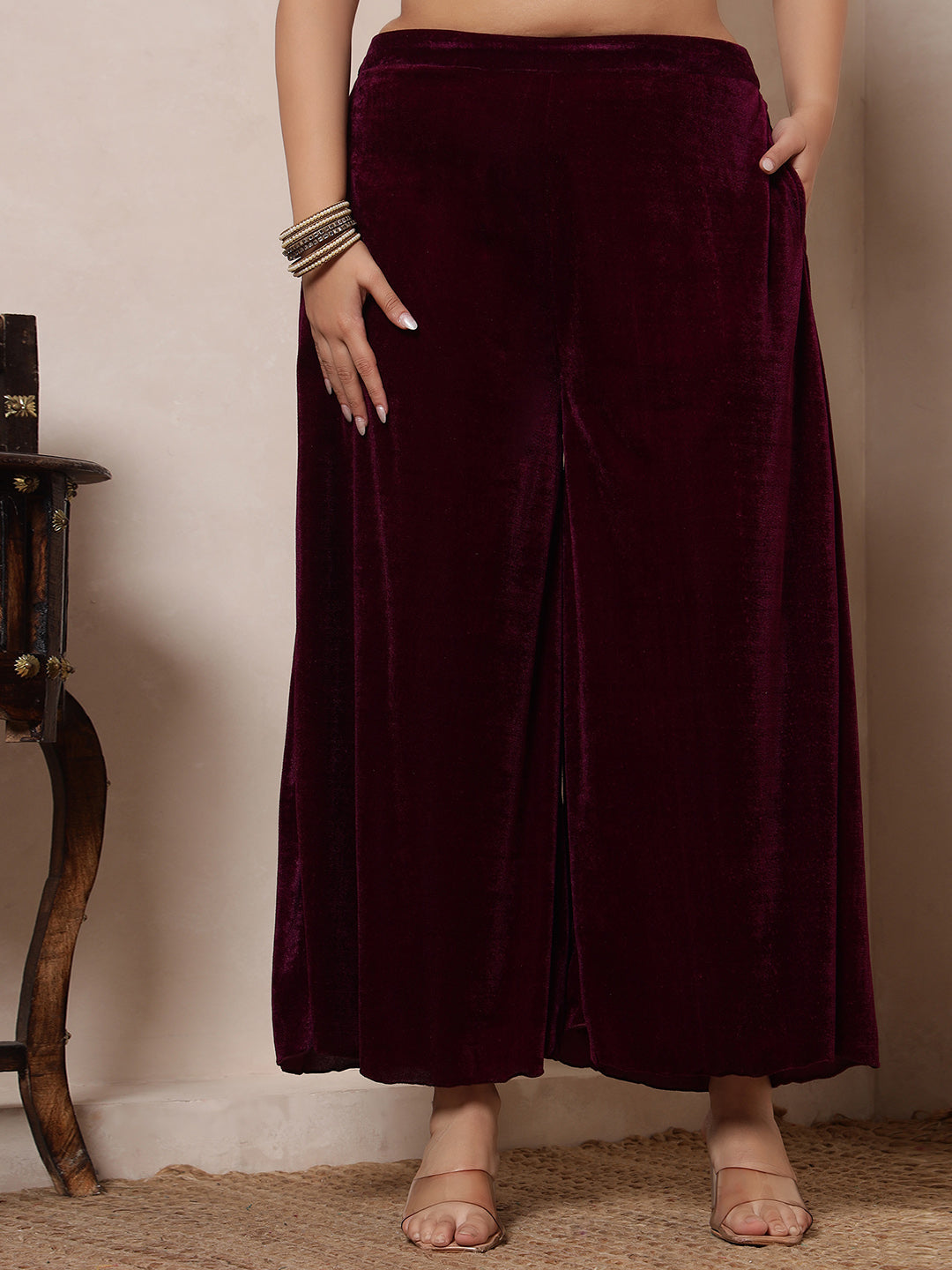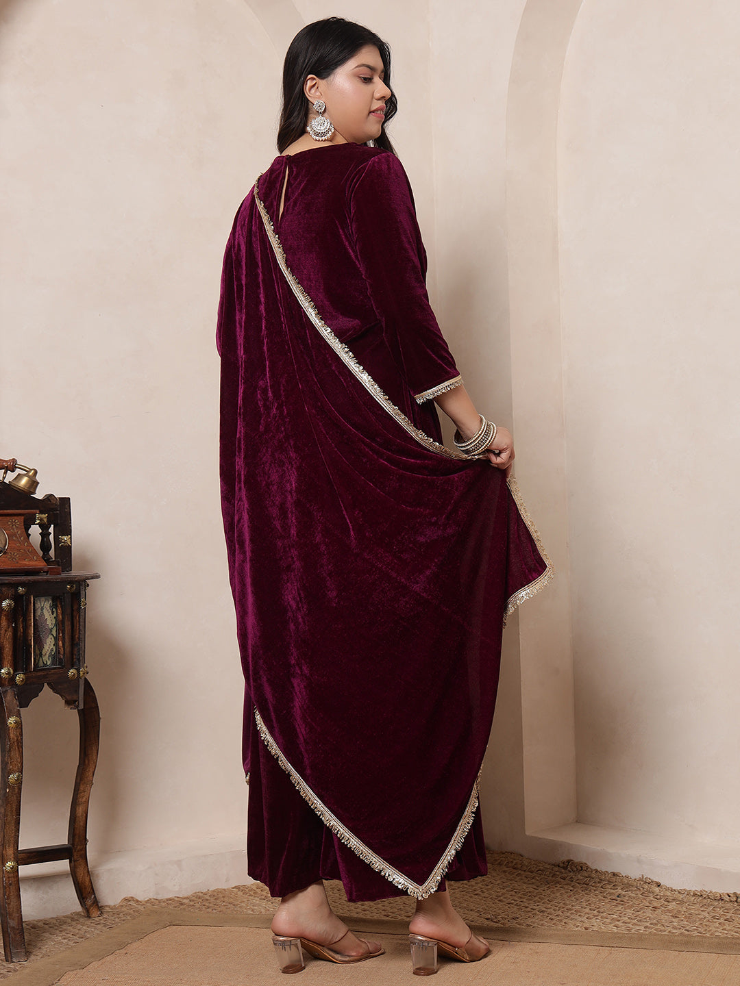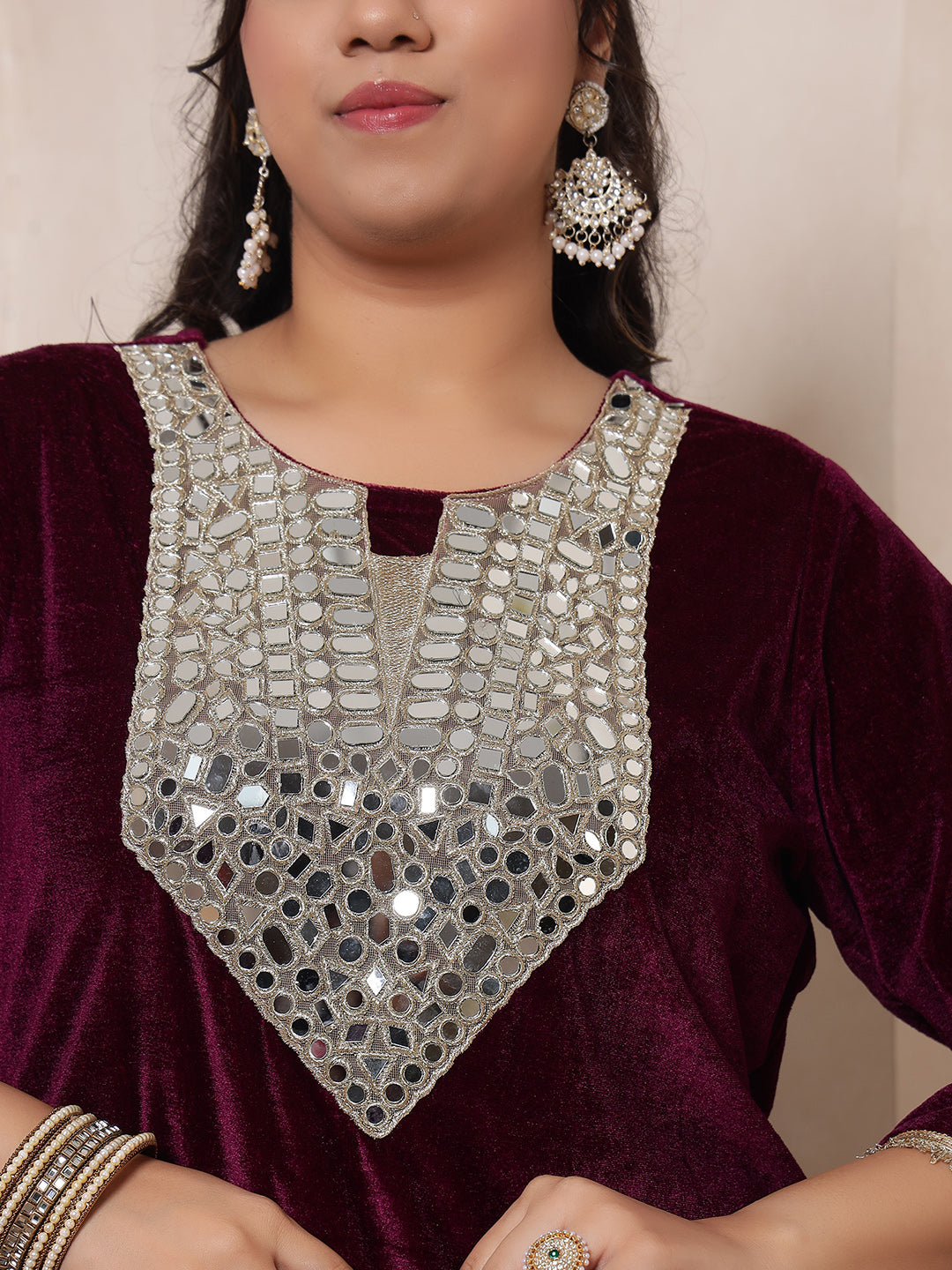 Velvet Wine Kurti Embroidered Neck Patch Sharara With Dupatta Women Indo Western Women Co-Ord Set