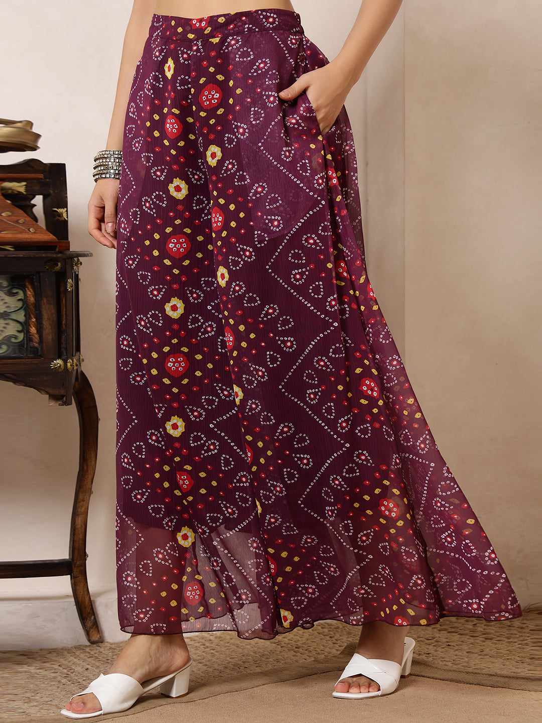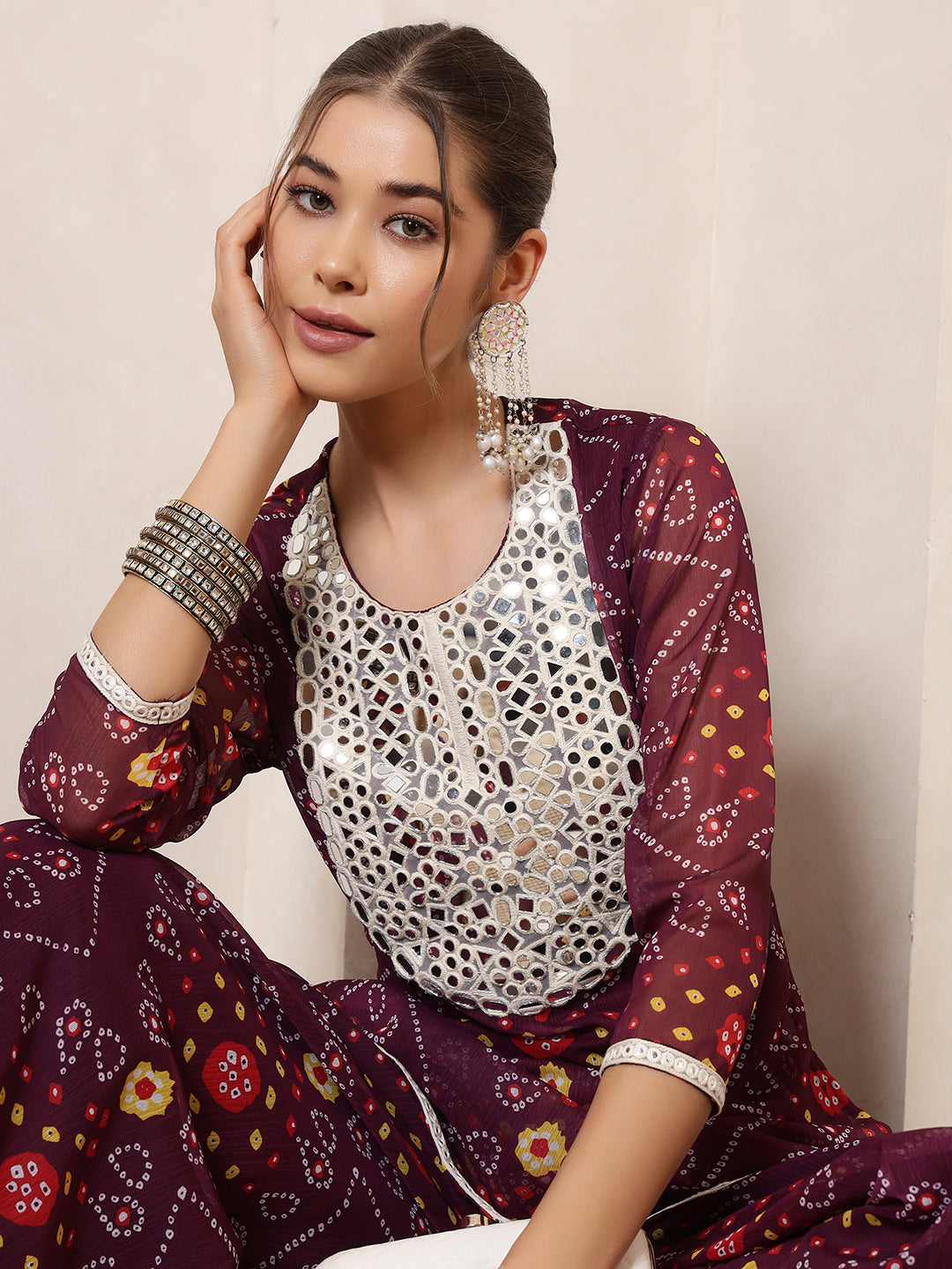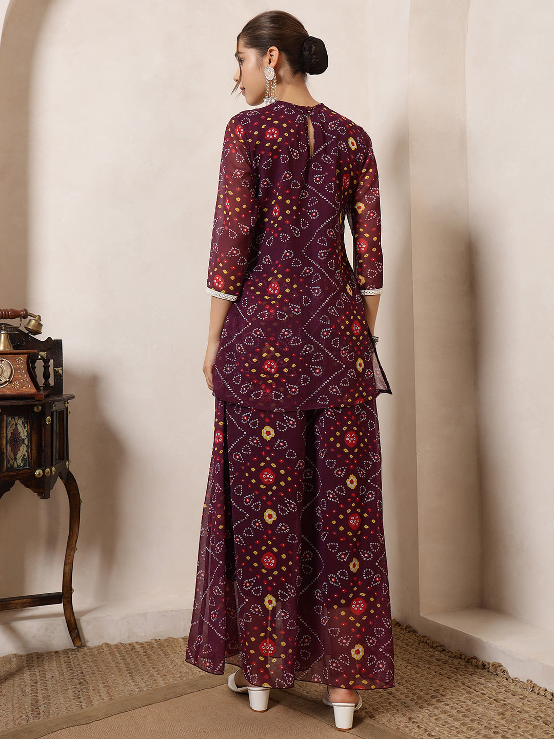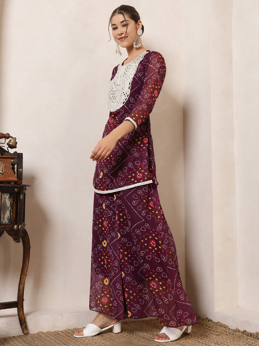 Wine Bandhani Kurti With Palazzo Indo Western Women Co-Ord Set
