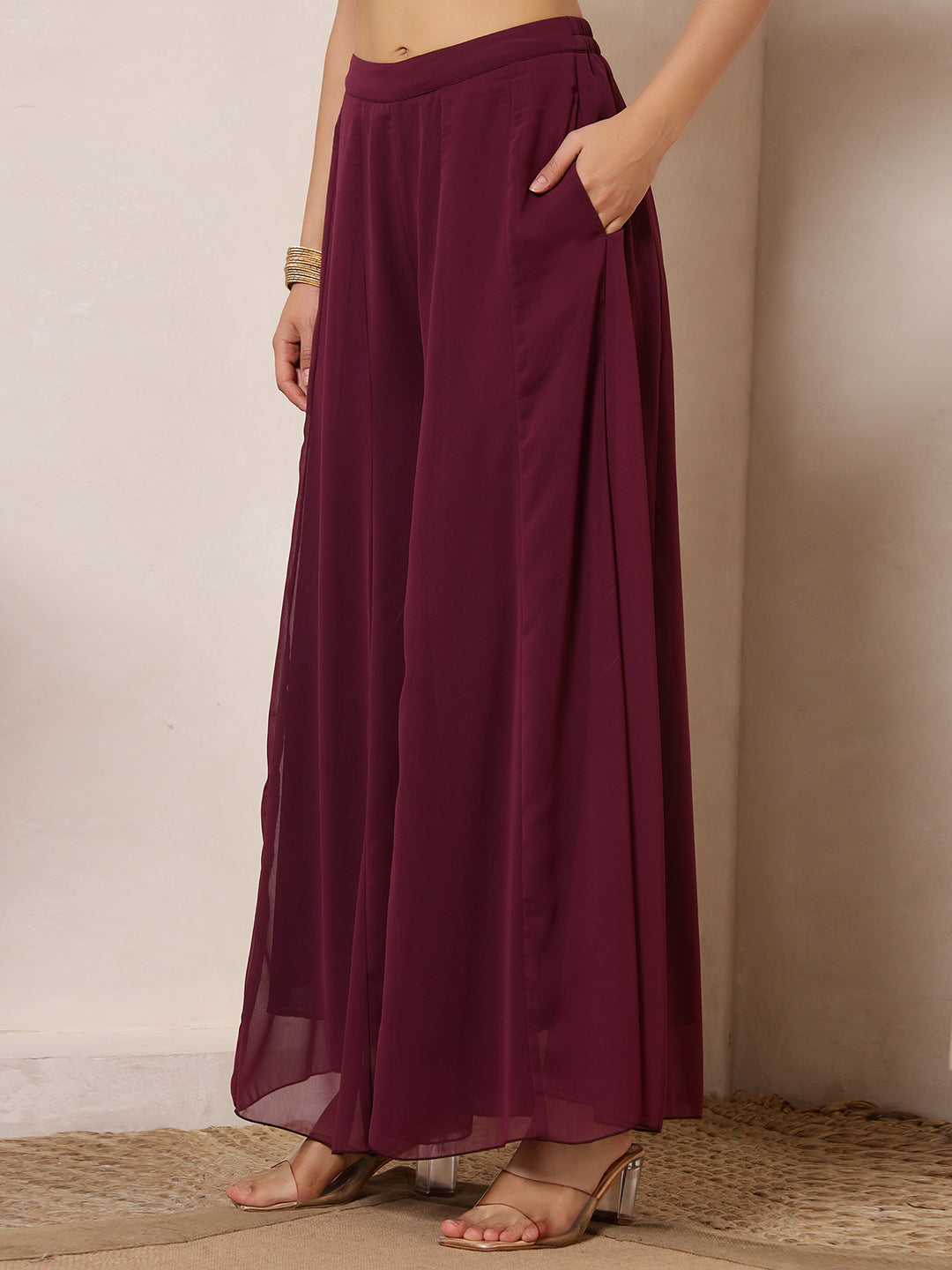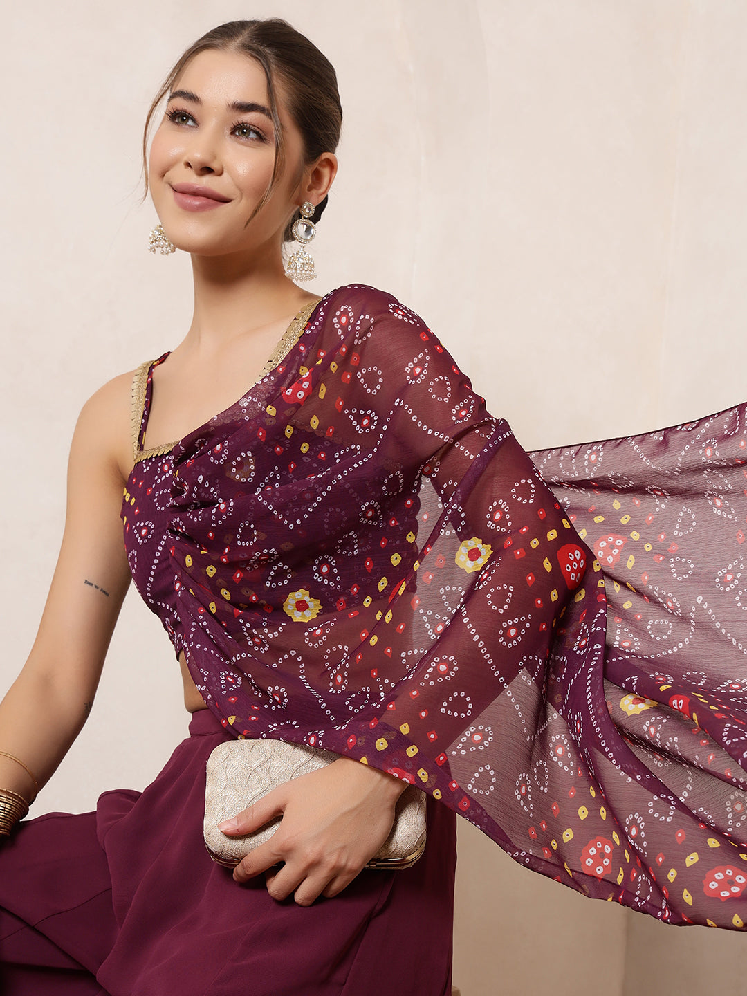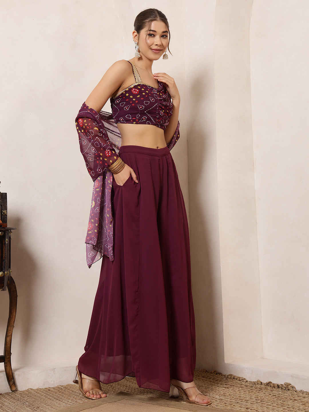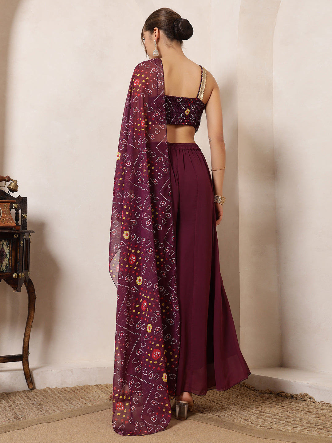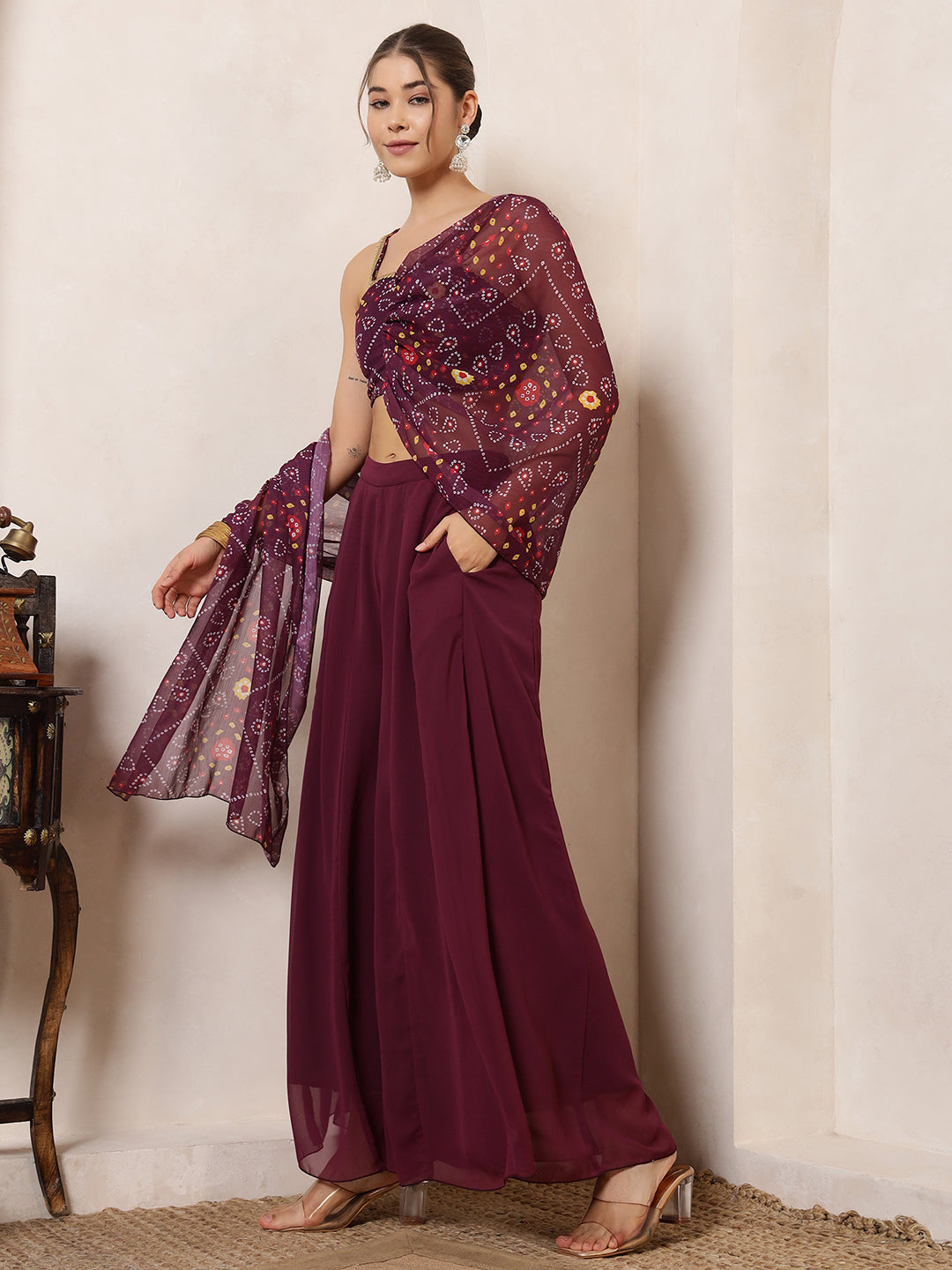 Wine Bandhani Printed Crop Top Attached Dupatta With Panel Sharara Indo Western Women Co-Ord Set