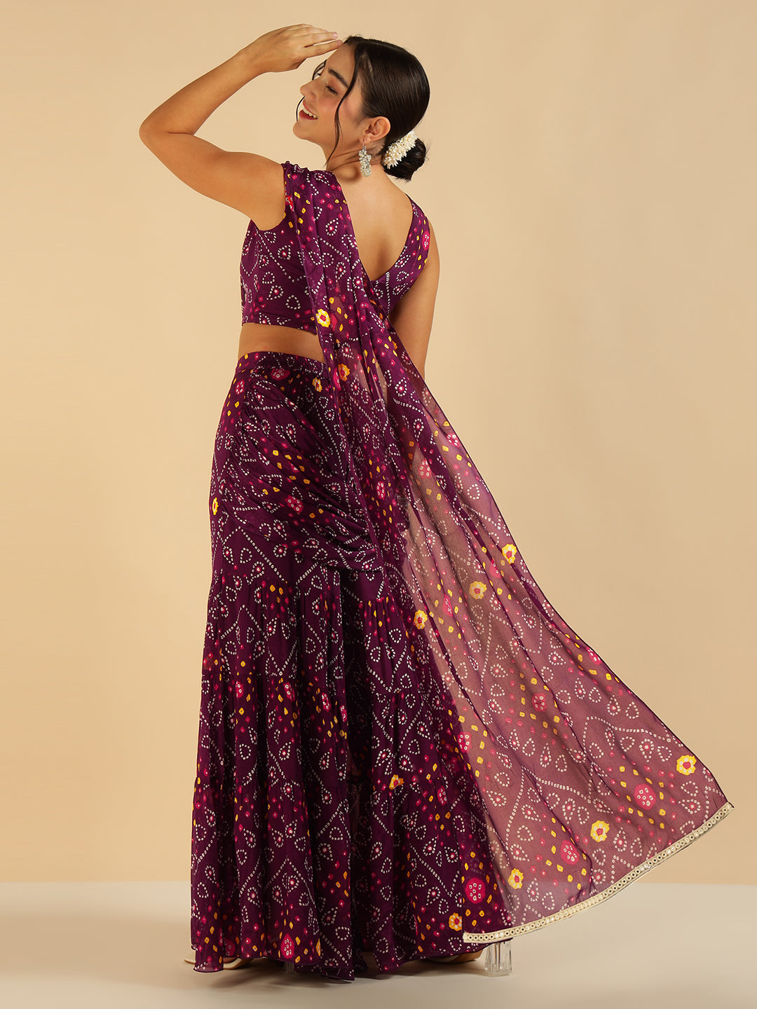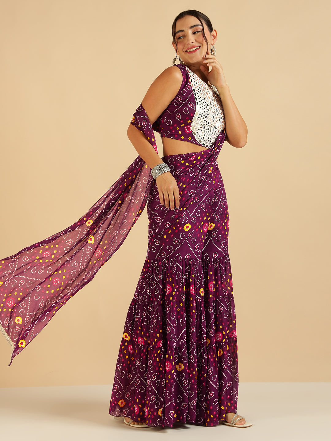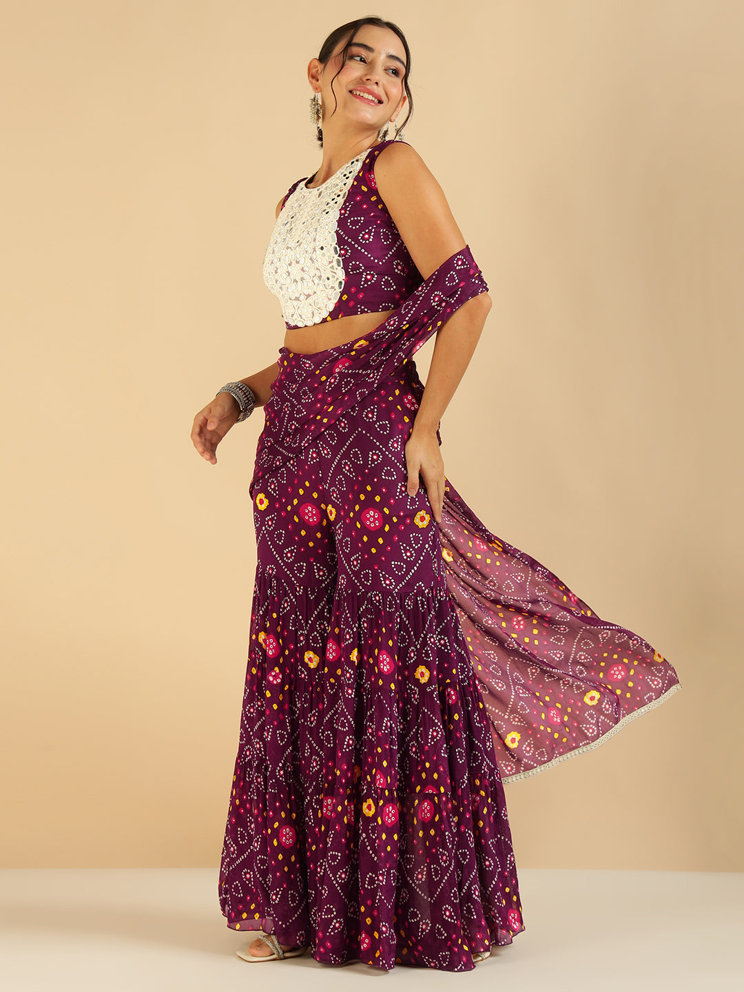 Wine Bandhani Printed Patch Work With Tiered Palazzo Saree Set For Women