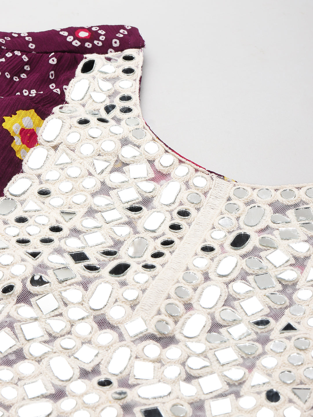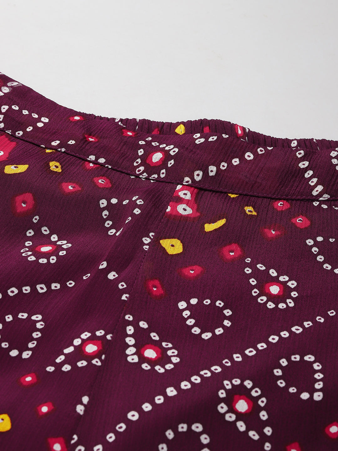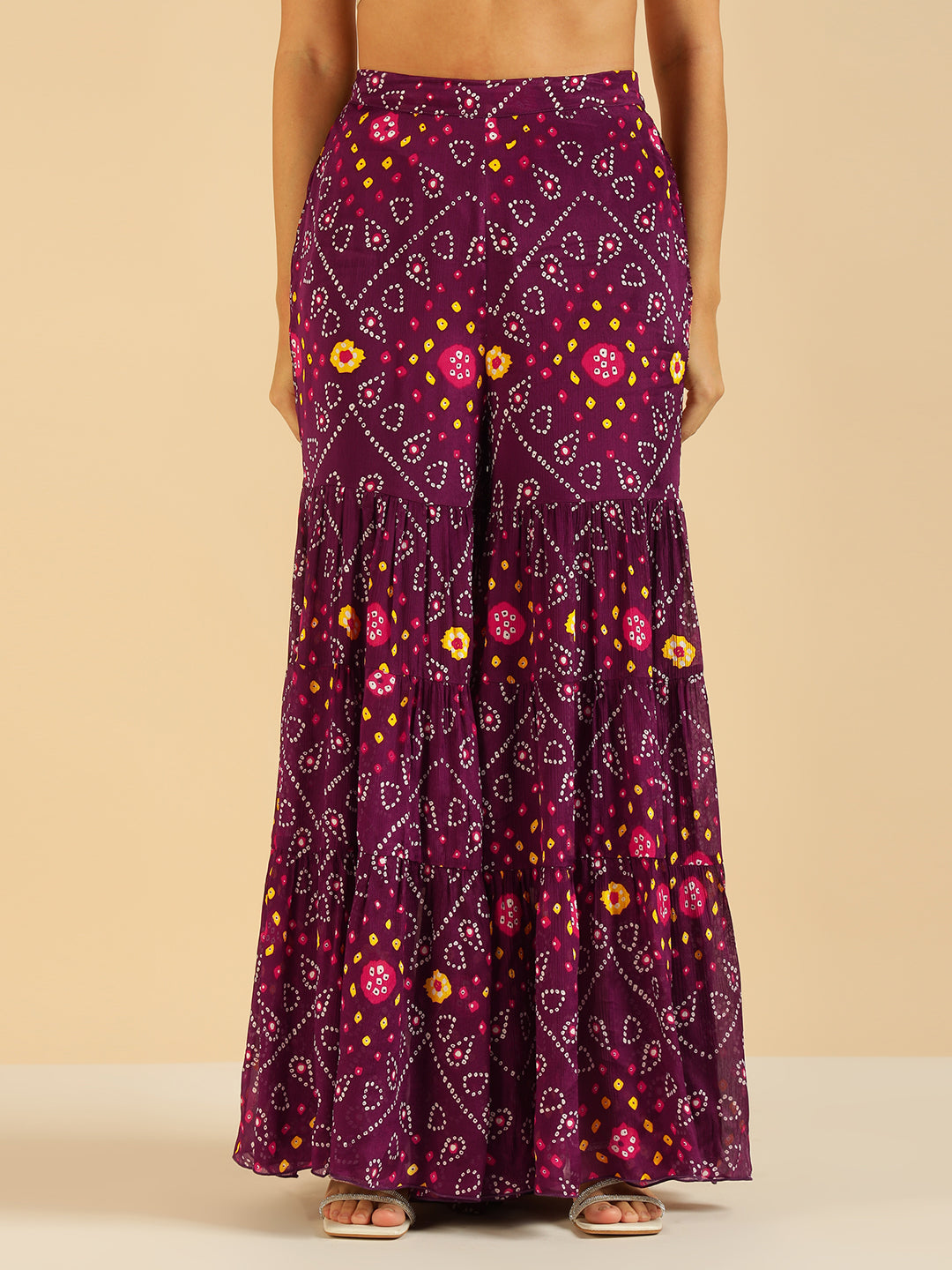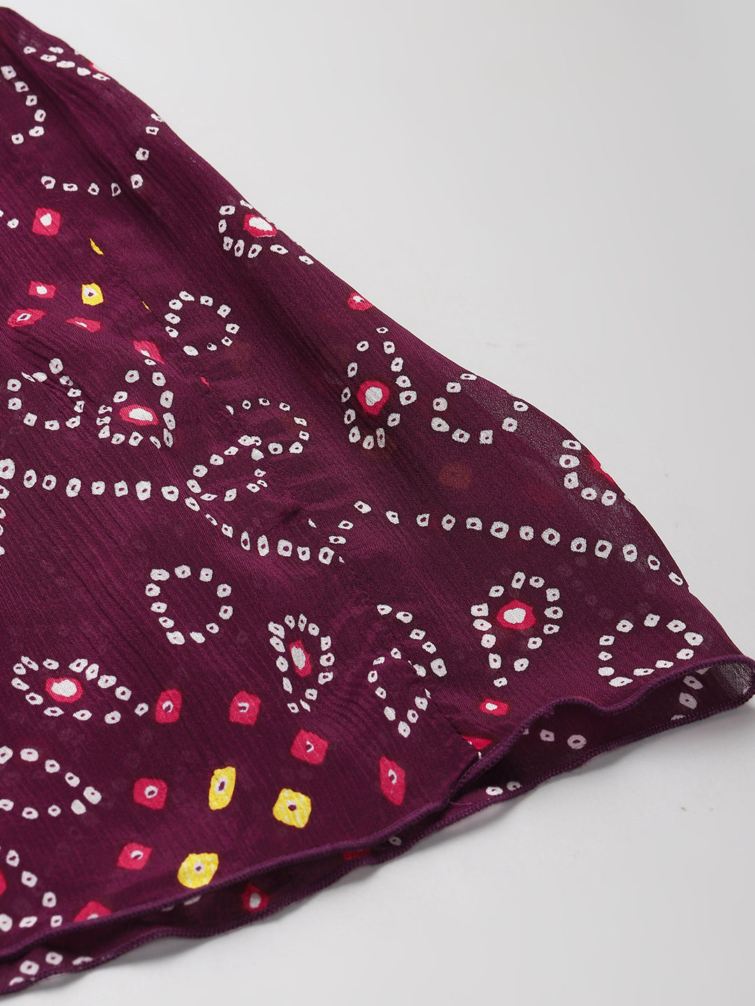 Wine Bandhani Printed Patch Work With Tiered Palazzo Saree Set For Women