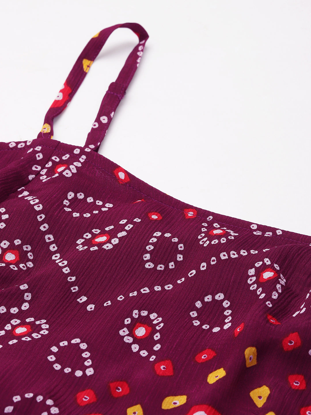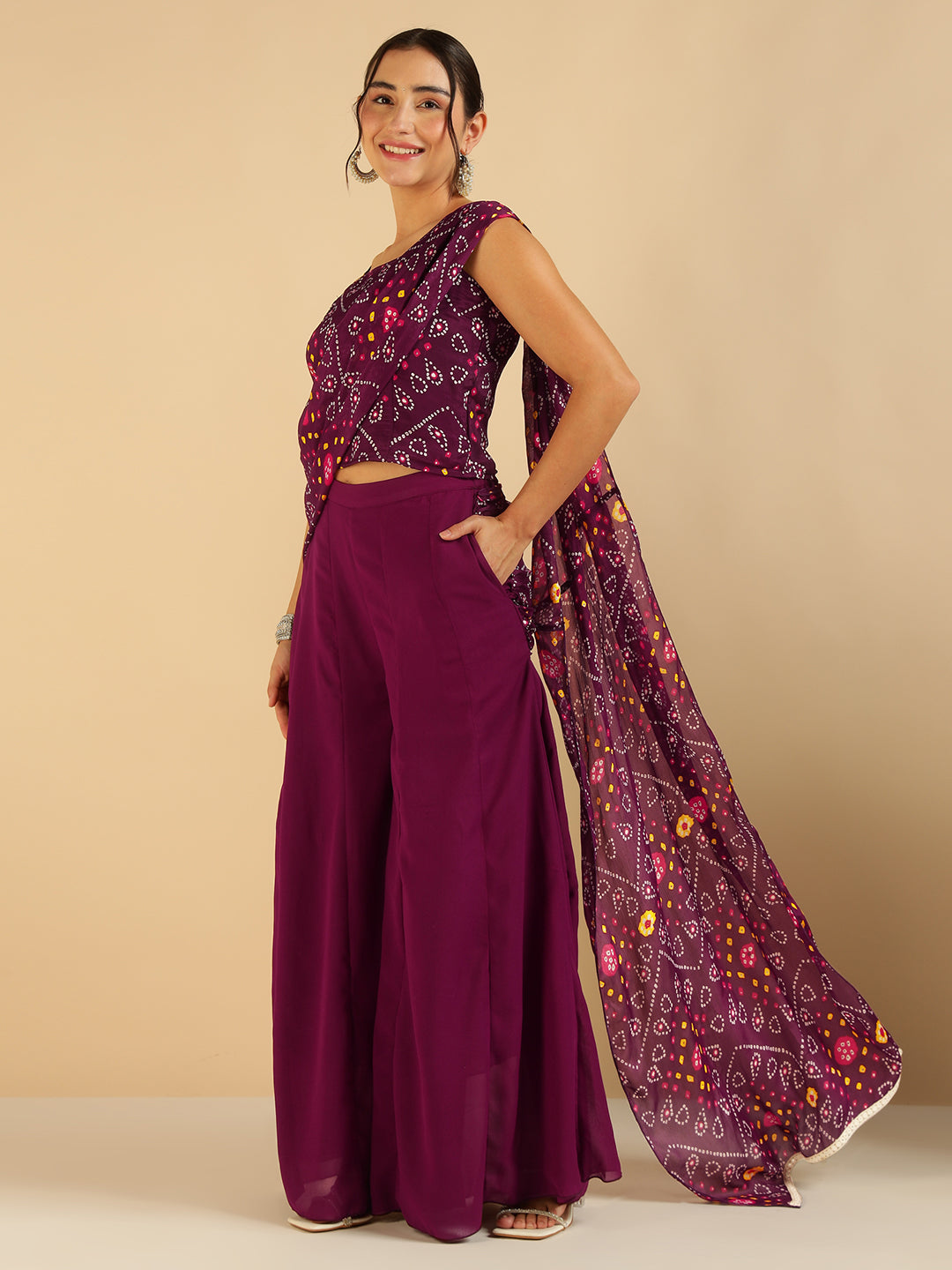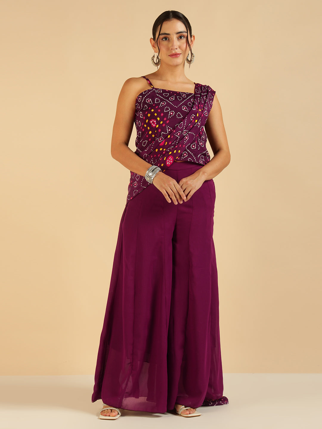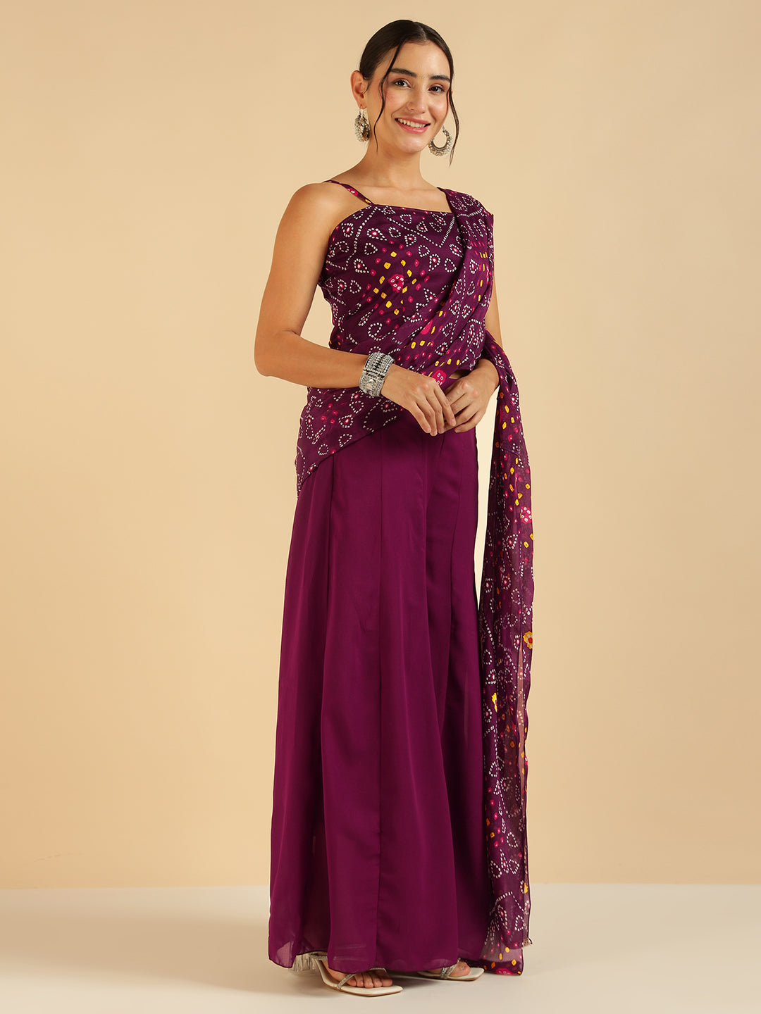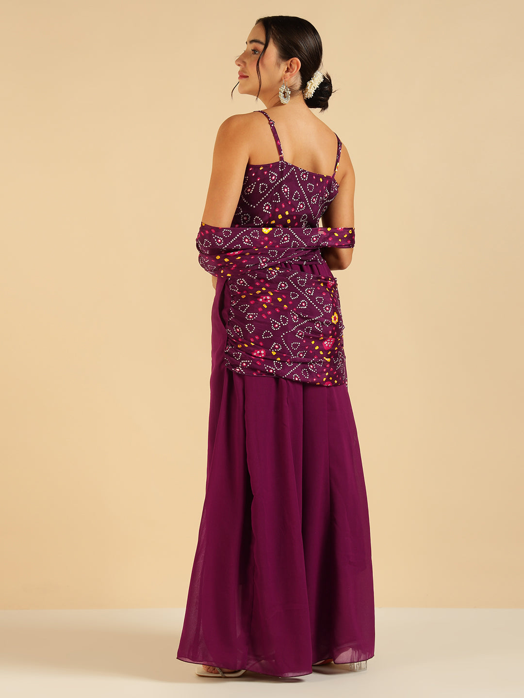 Wine Bandhani Printed Strappy Top With Sharara Saree Fusion Women Co-Ord Set