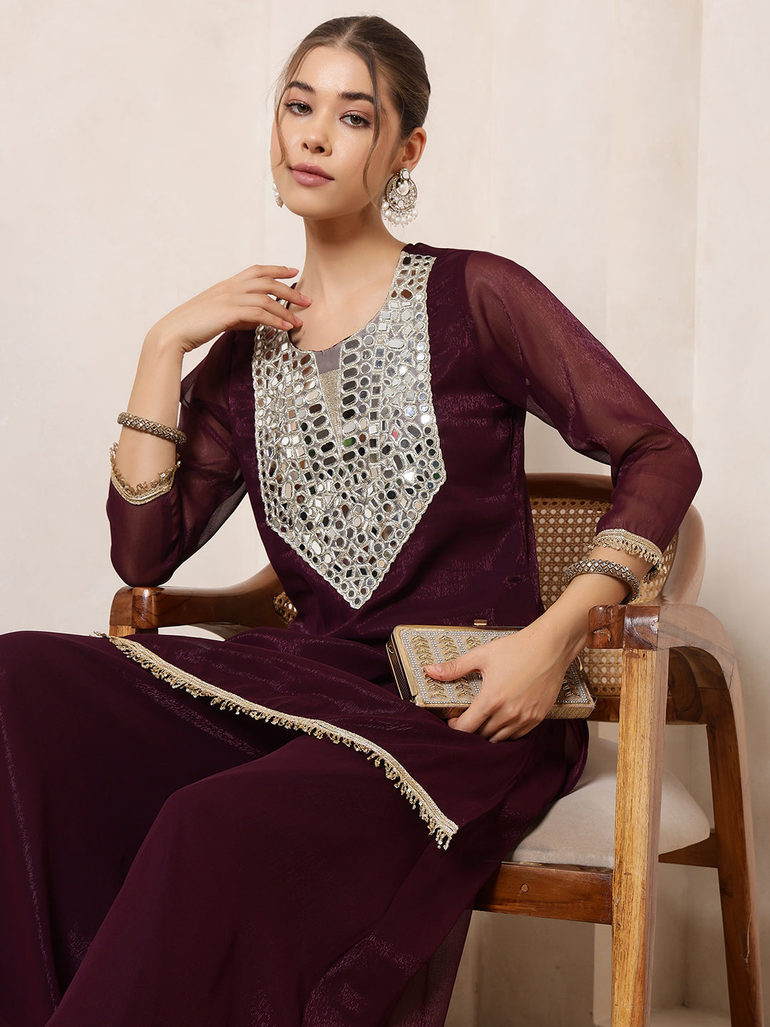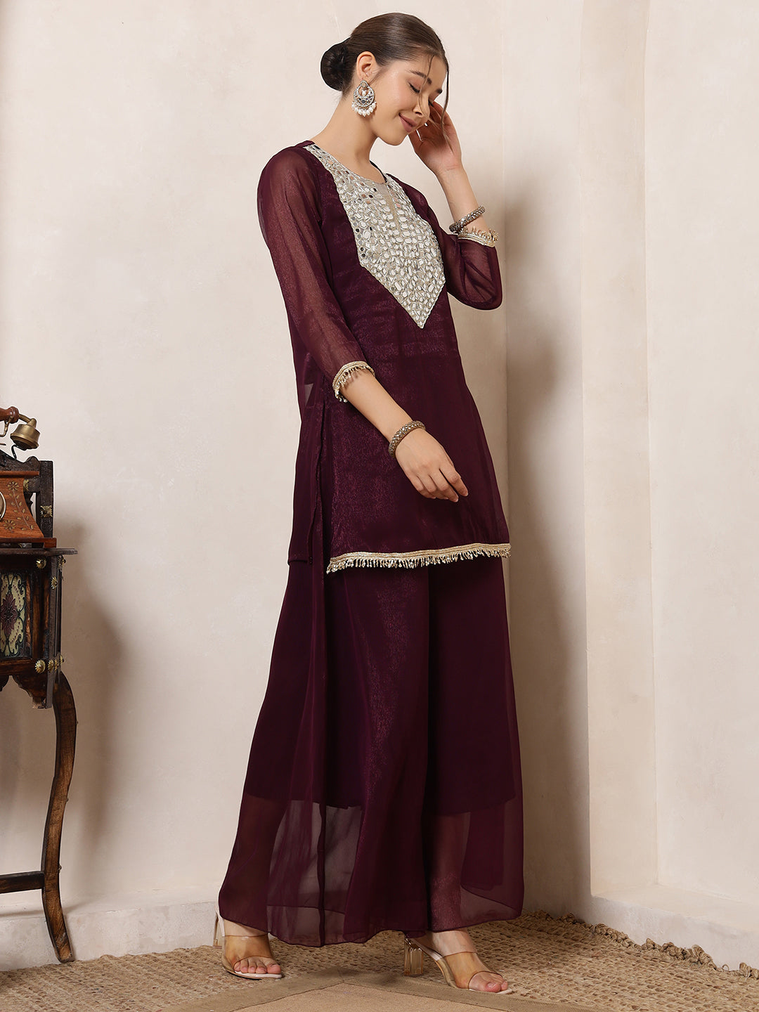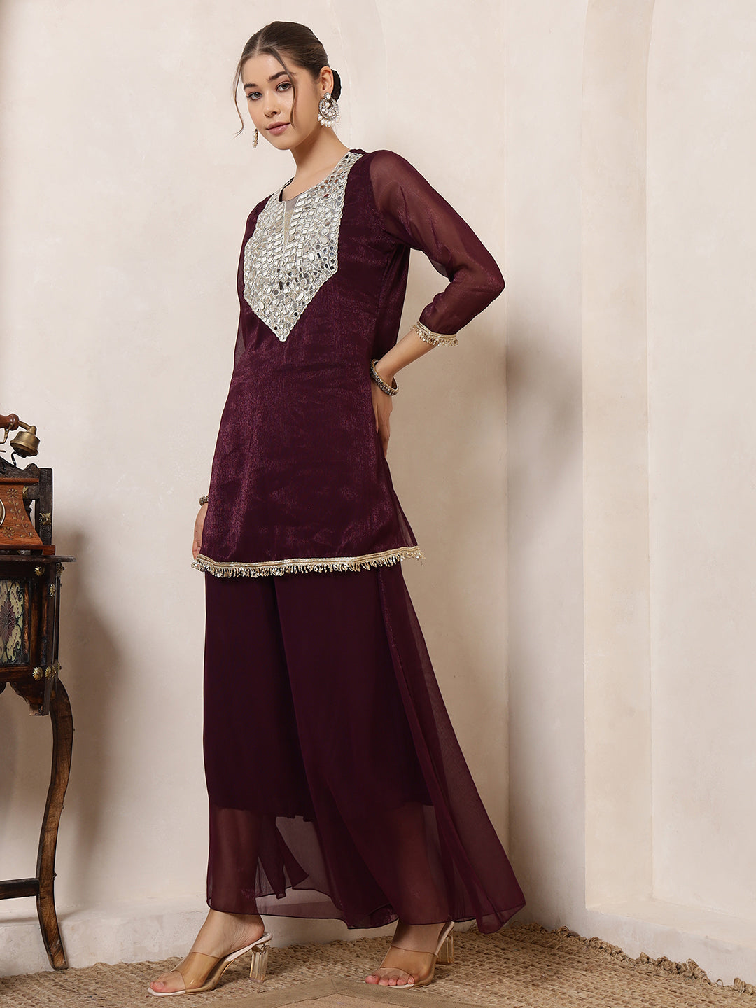 Wine Shimmer Embroidered Neck Patch Kurta With Palazzo Indo Western Women Co-Ord Set