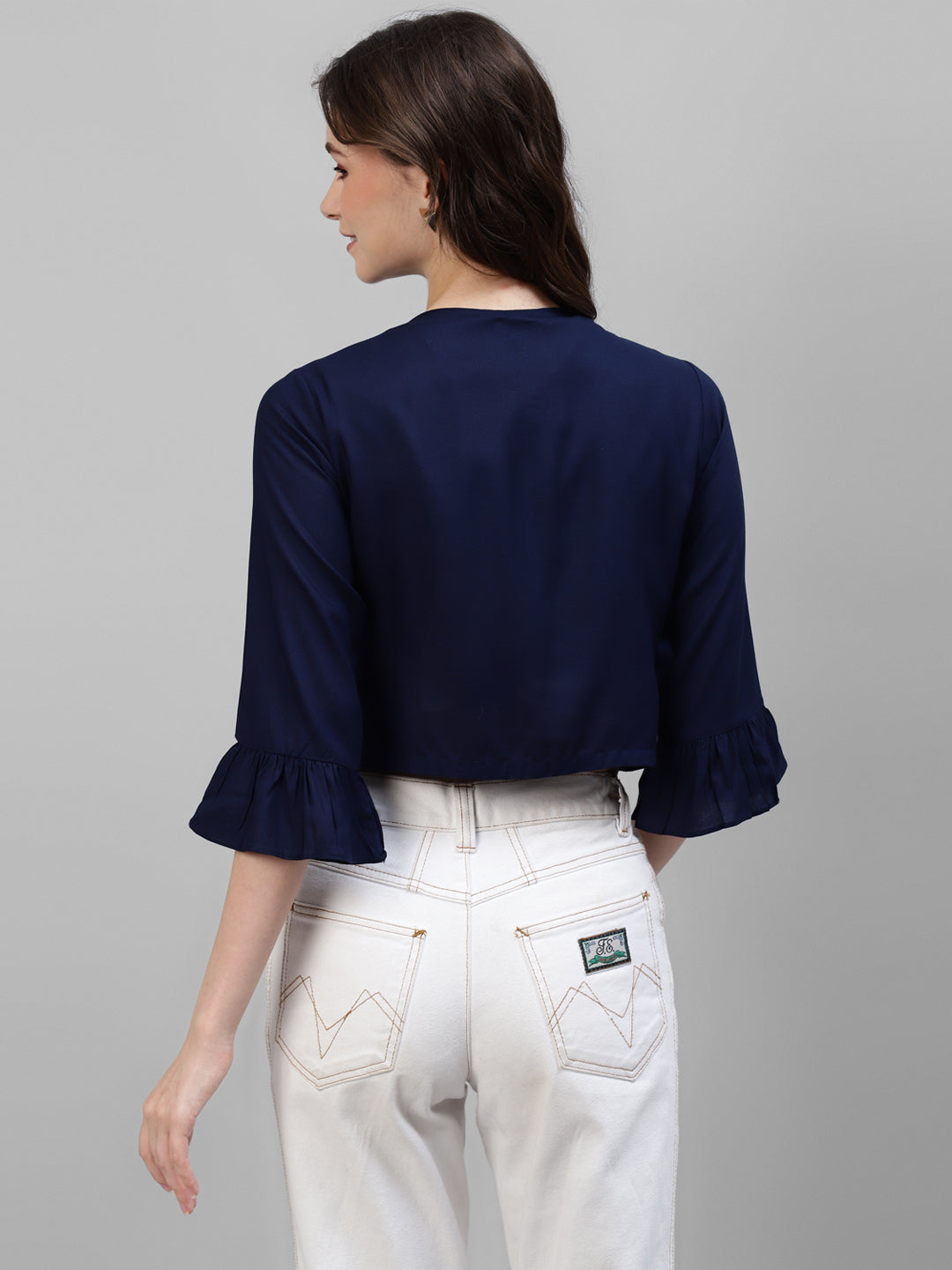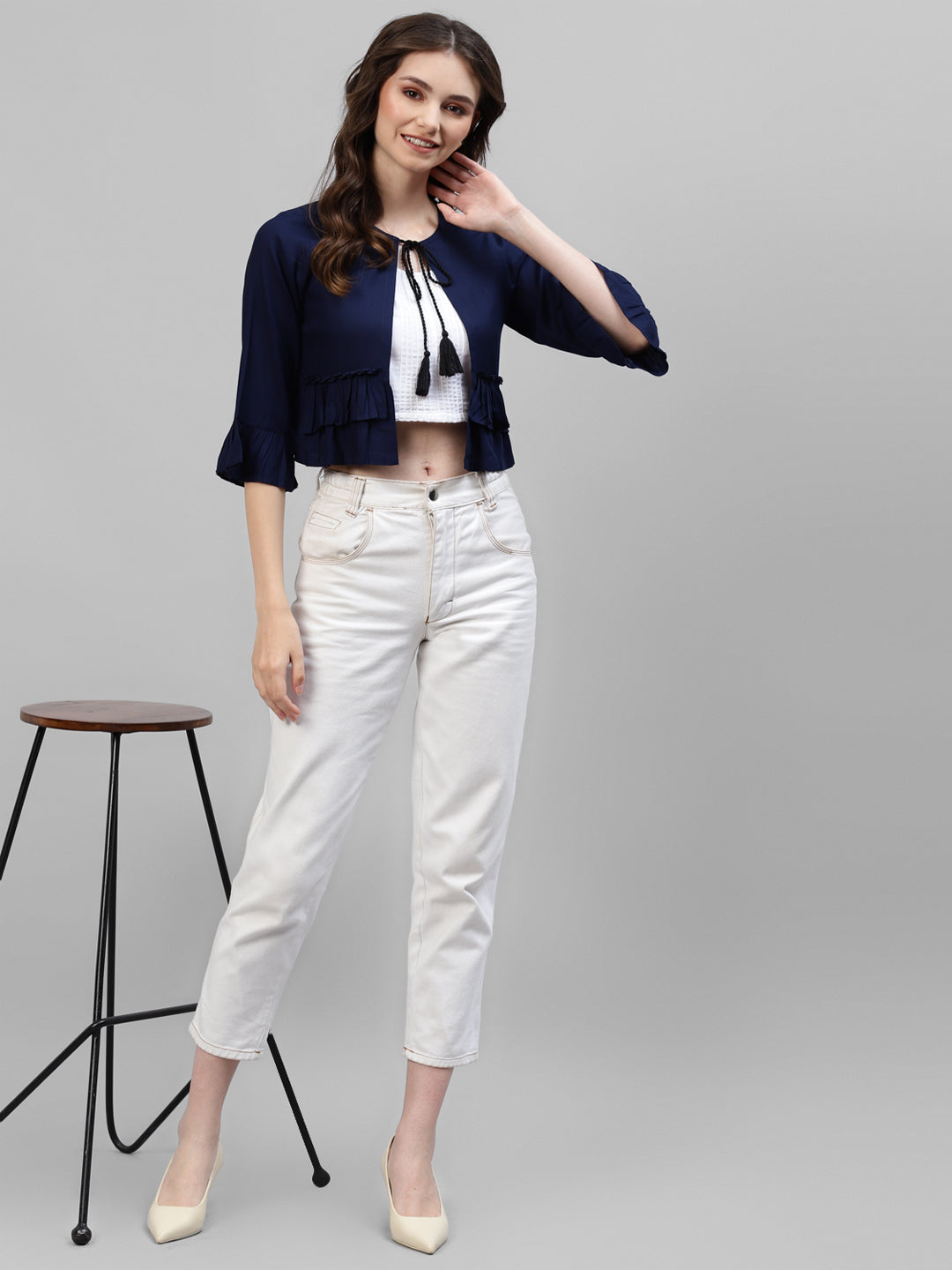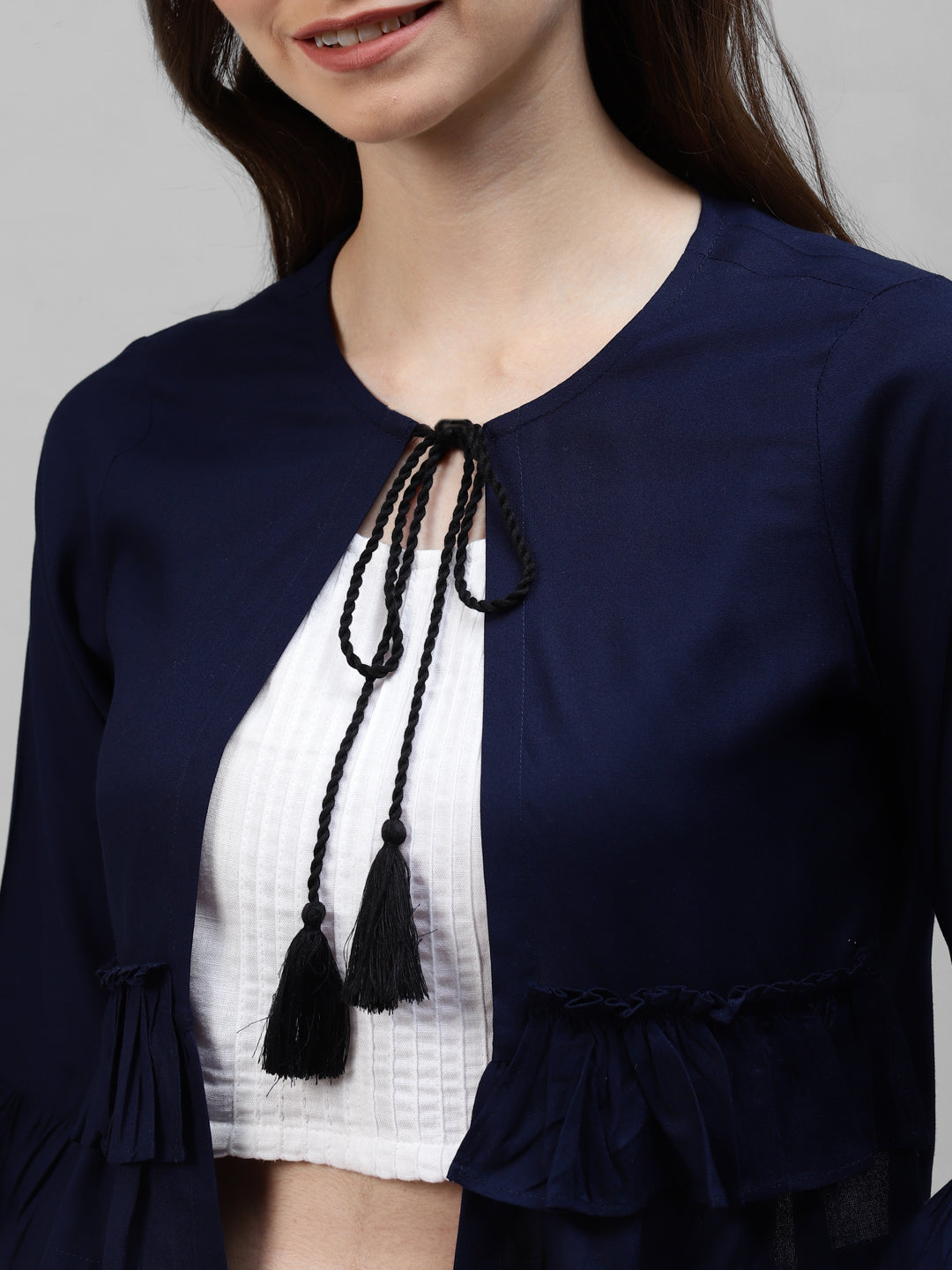 - Think of Deebaco every time you see such stylish shrug with quality craftsmanship. This navy blue shrug is a causally glamorous delight made from premium quality rayon fabric. The round neckline has been supplied with a Dori which you can fasten or unfasten, according to the rest of your outfit. The frilly sleeves add that semi-formal feel, making this shrug for women a must-have when Fall rolls around. Pair it with a white T-shirt, flared blue jeans, and white shoes for a sporty-chic look.