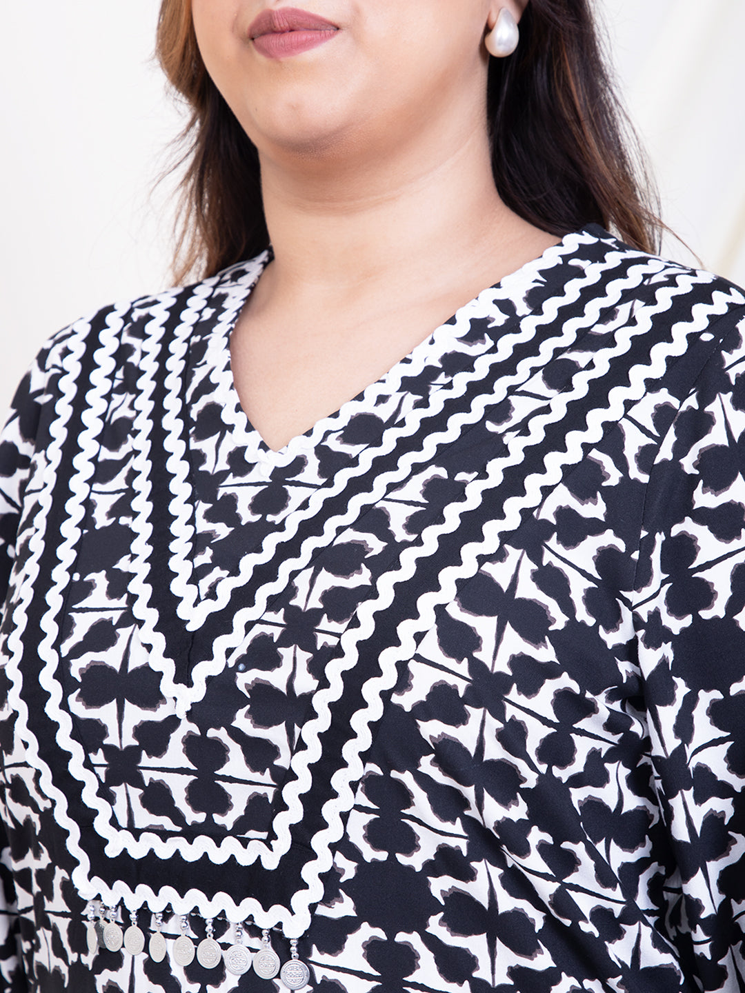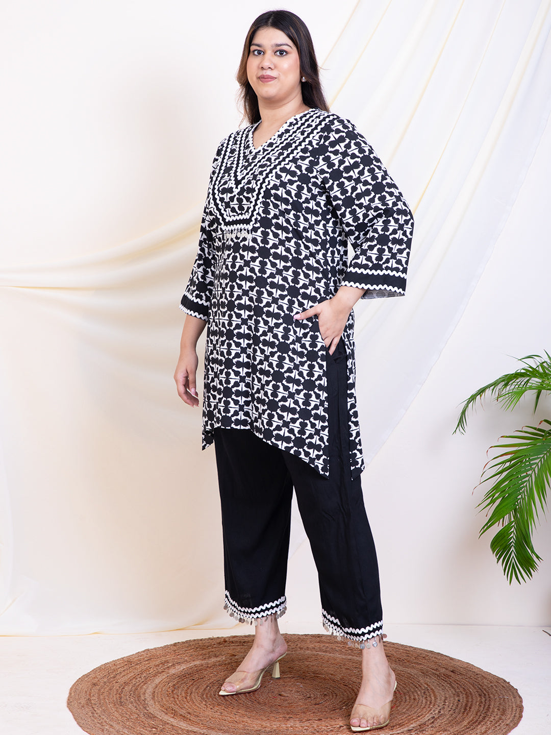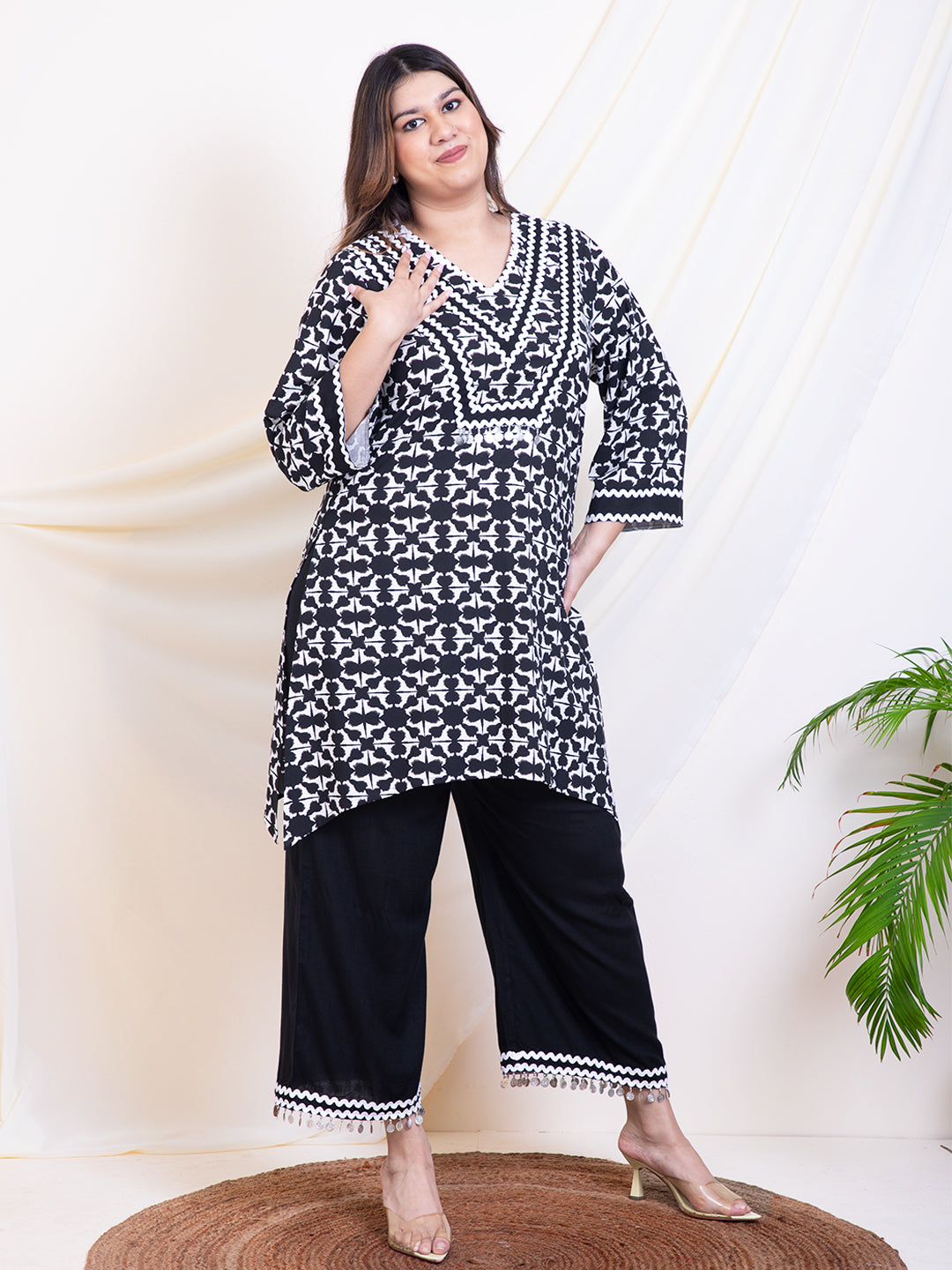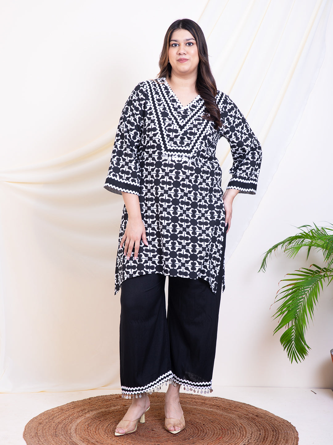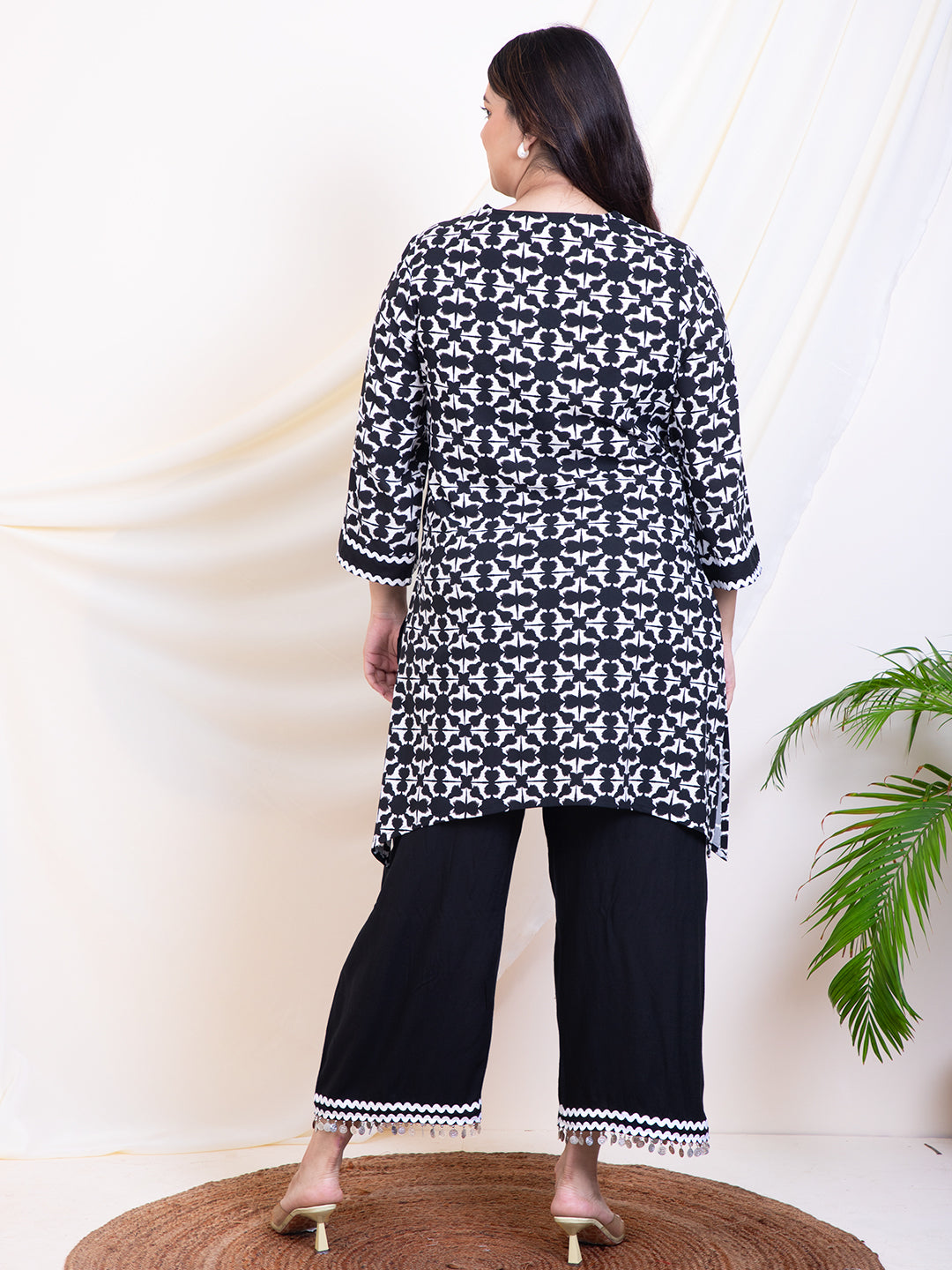 Women's Plus Size Black Geometrical Printed Kurta With Palazzo Ethnic Women Co-Ord Sets