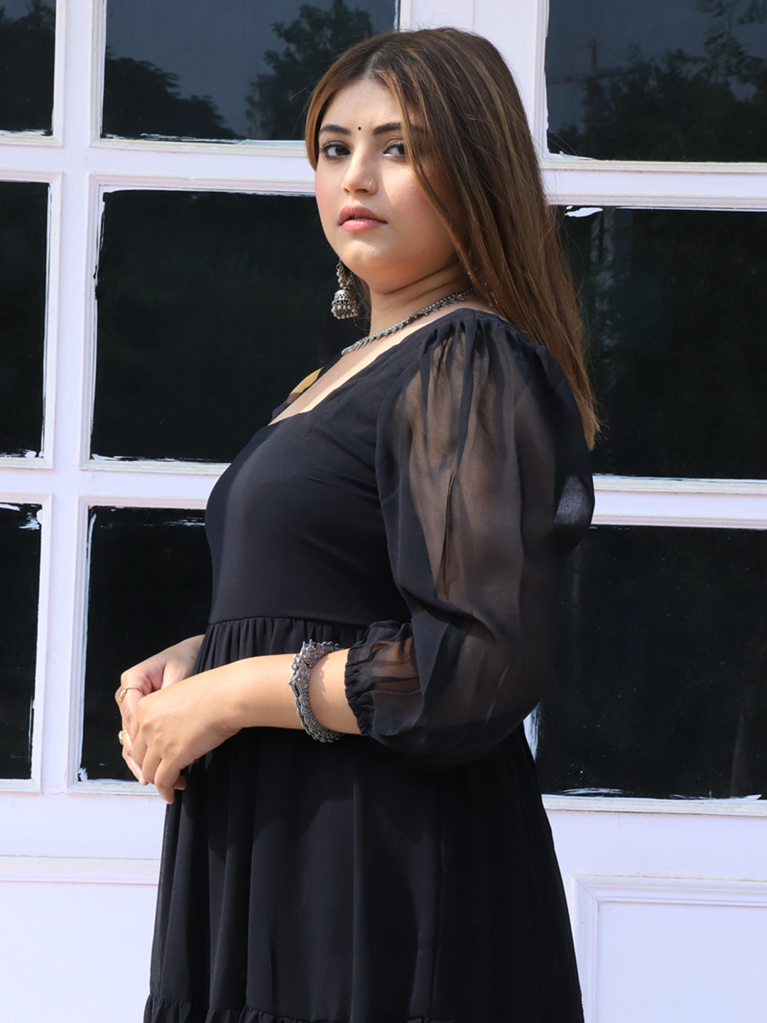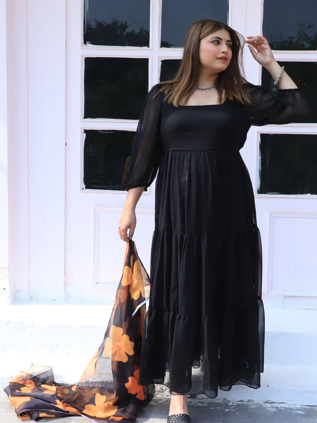 Womens Plus Size Black Georgette Kurti With Floral Organza Dupatta