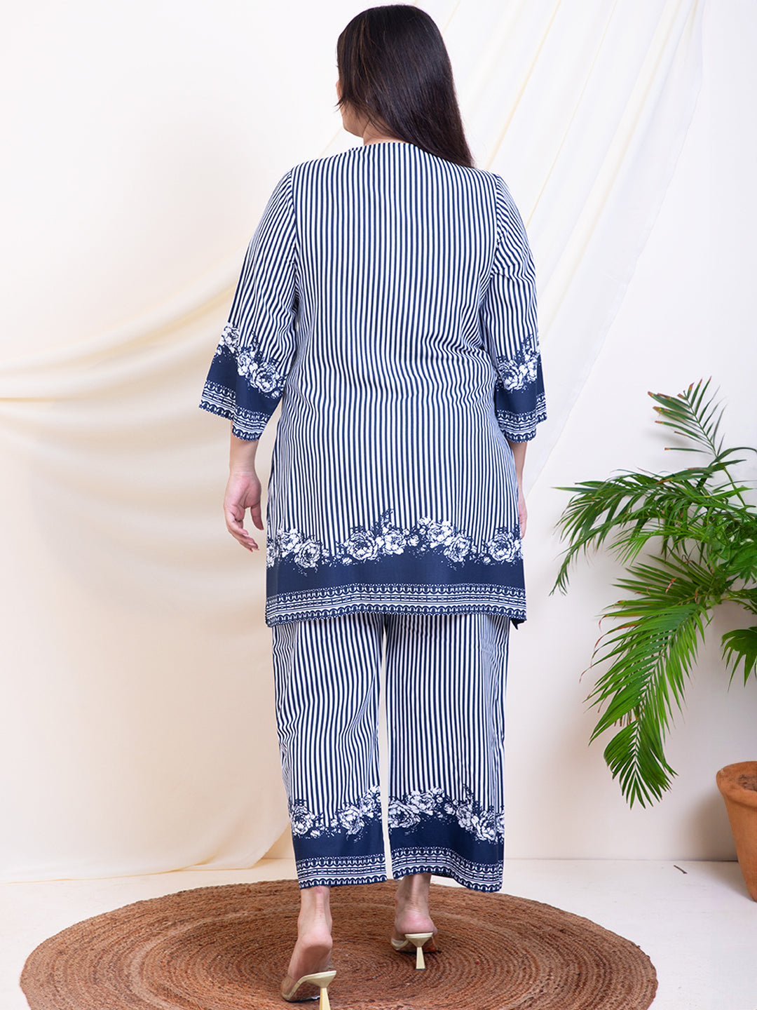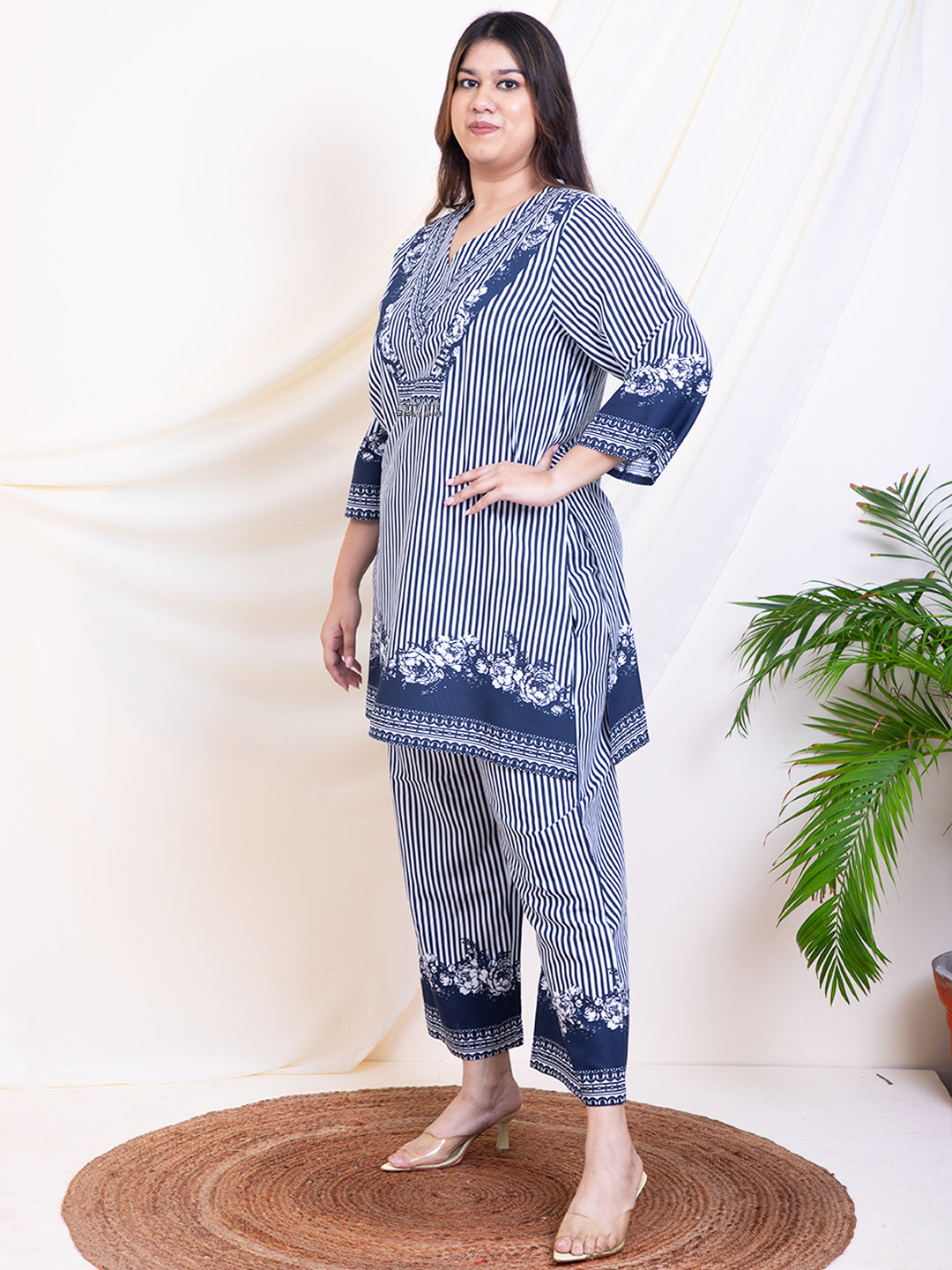 Women's Plus Size Blue Striped Printed Ethnic Women Co-Ord Sets
