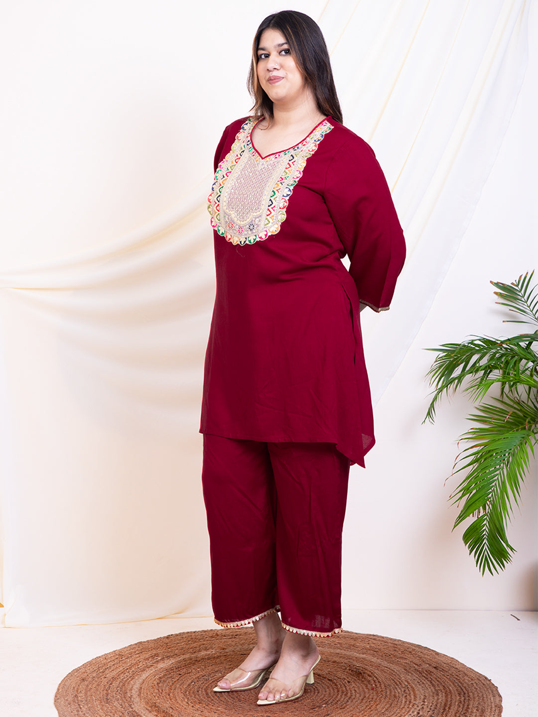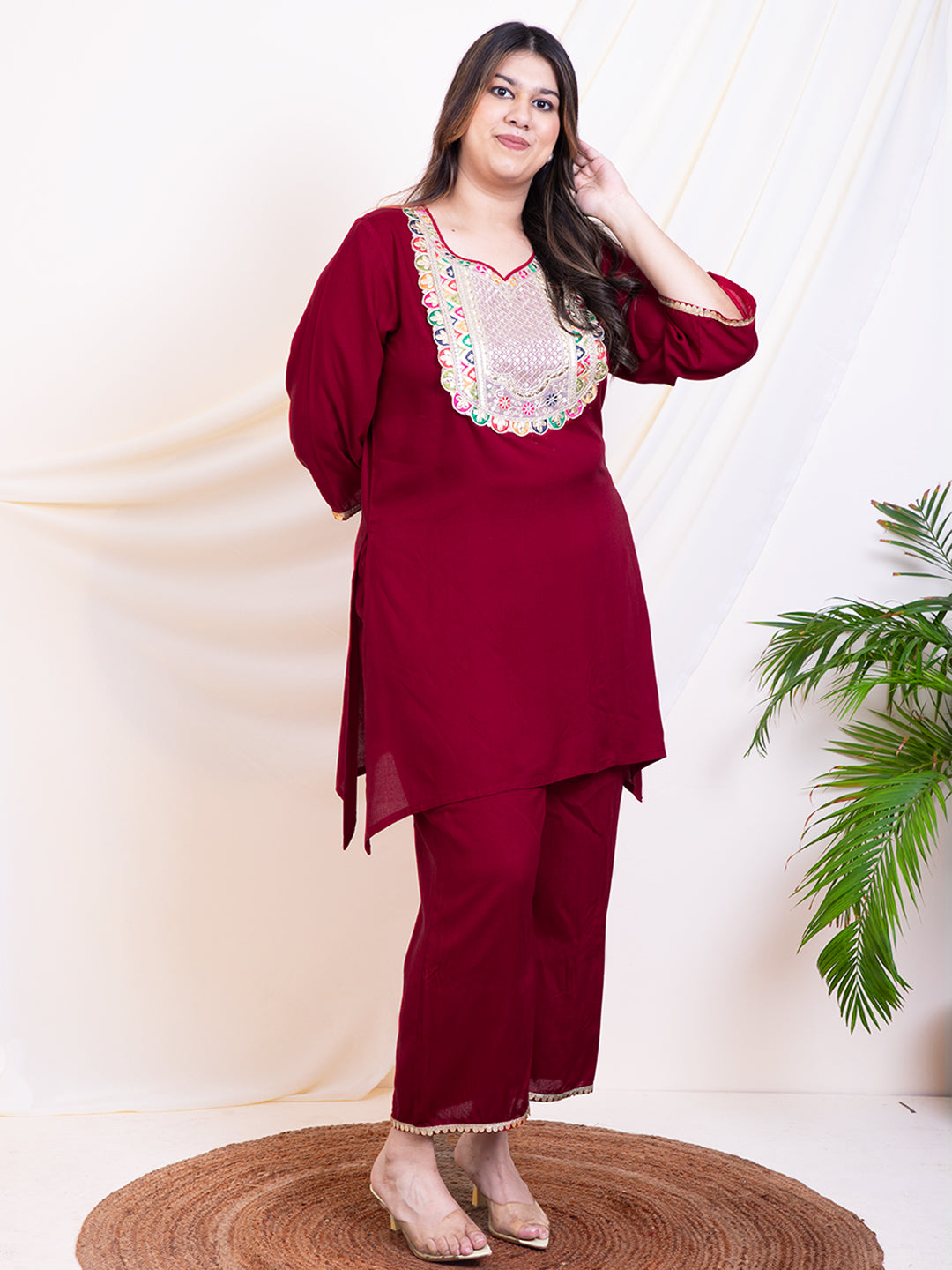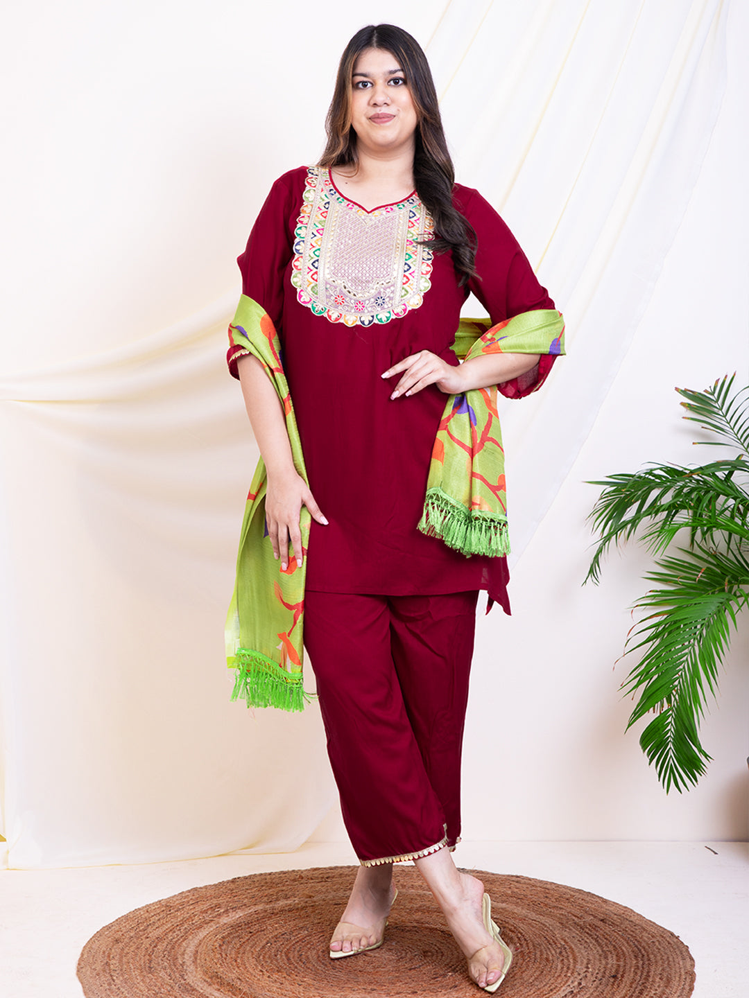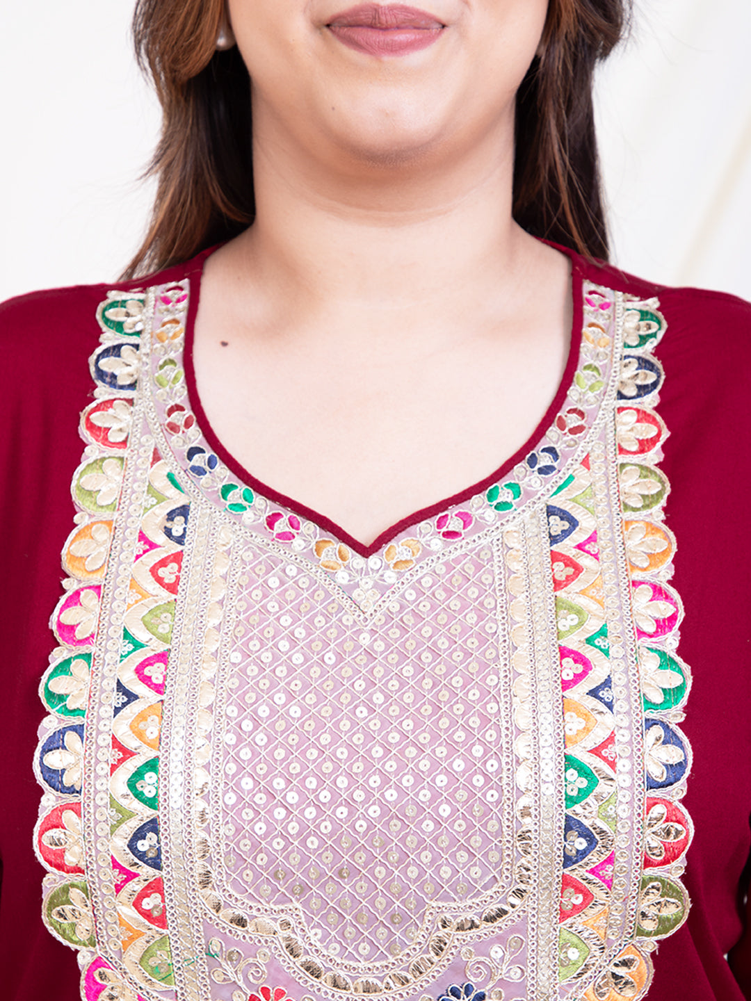 Women's Plus Size Maroon Embroidery Yoke Design Women Kurta Sets With Dupatta