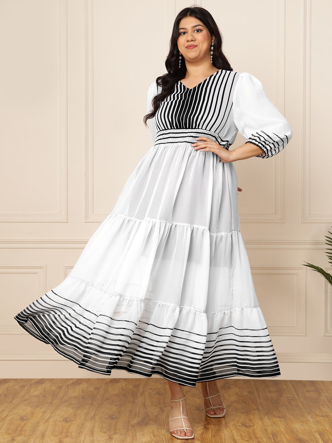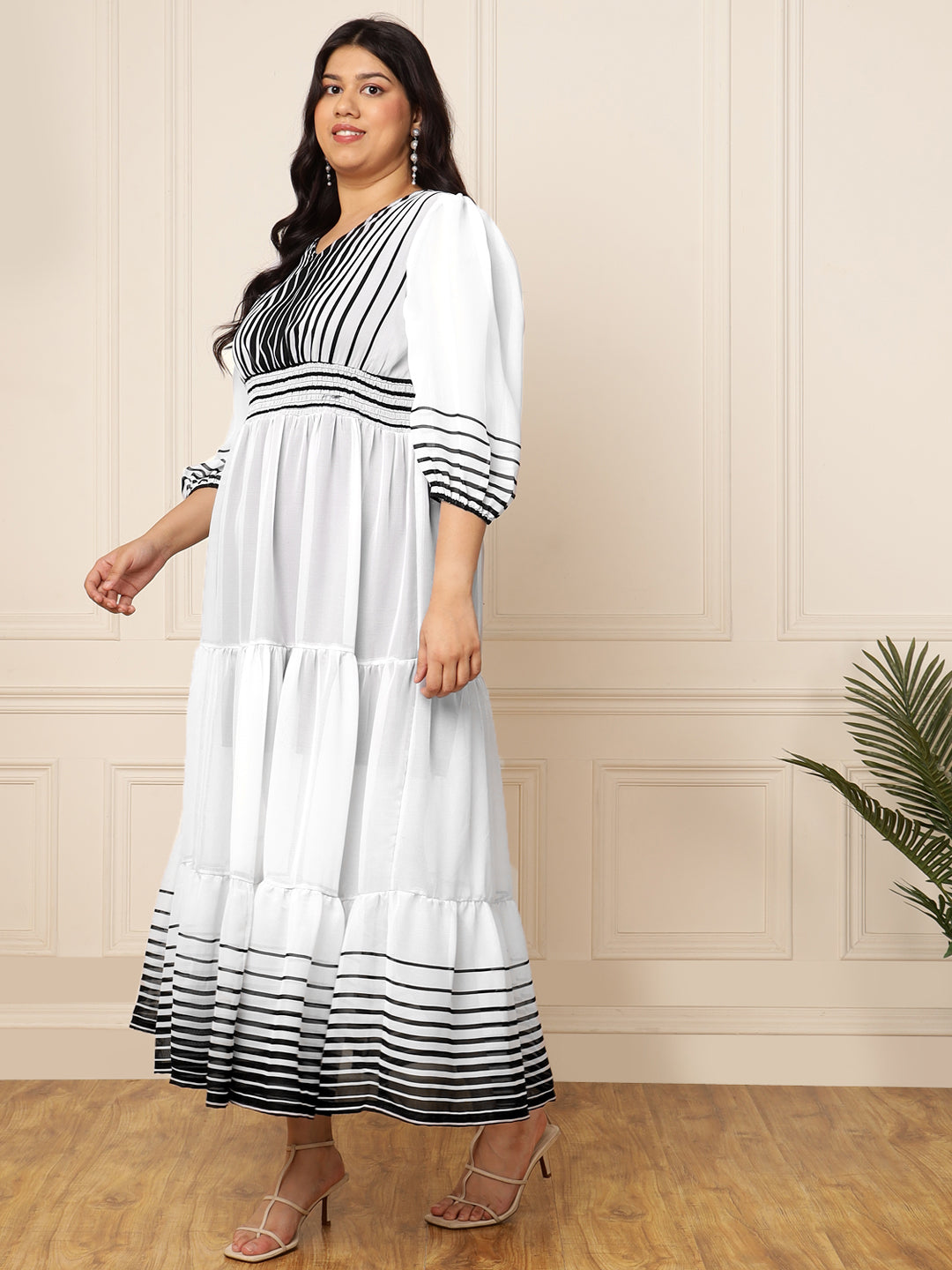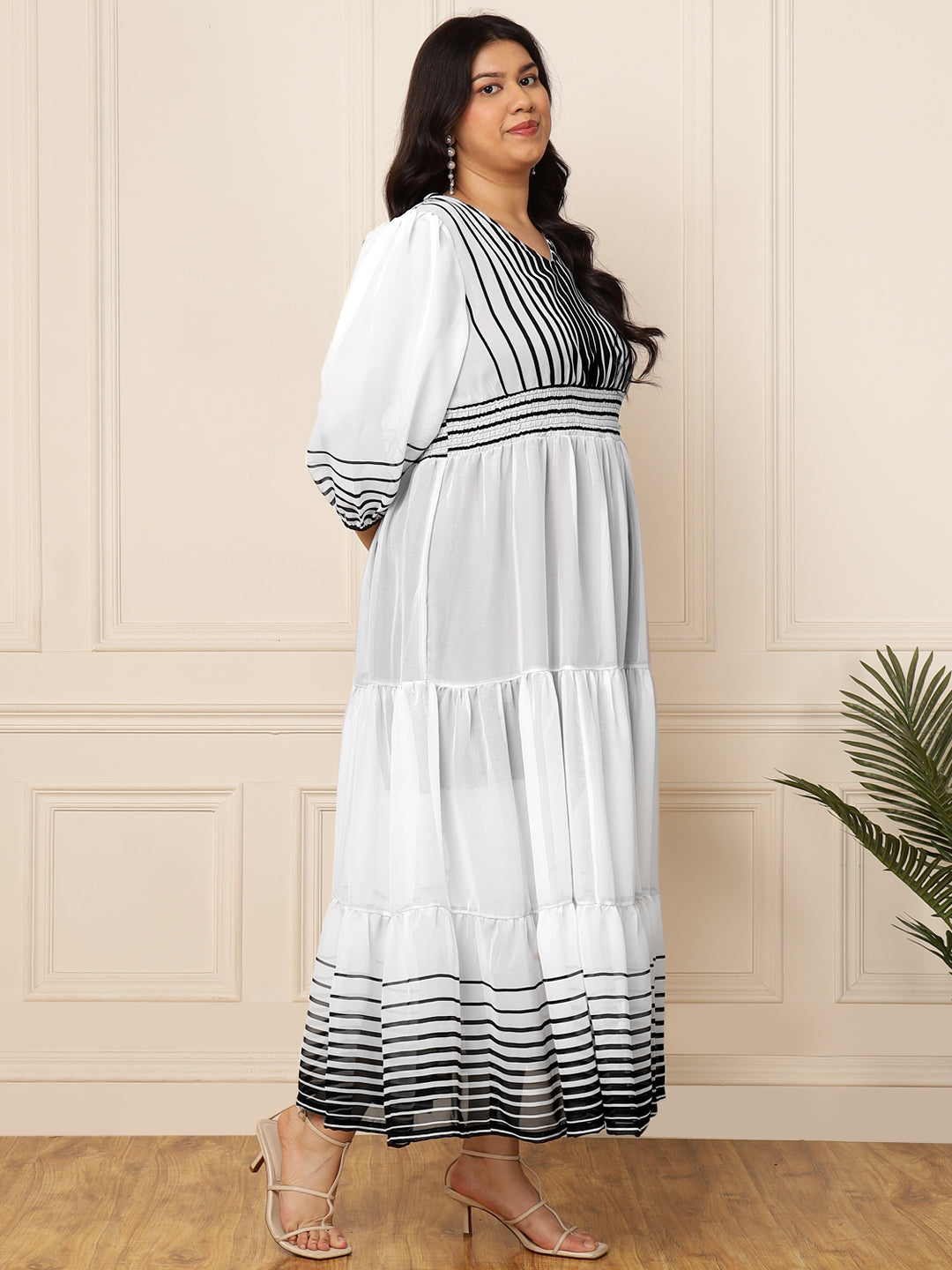 Women's Plus Size White Georgette Stripe Printed Tiered Maxi Dress