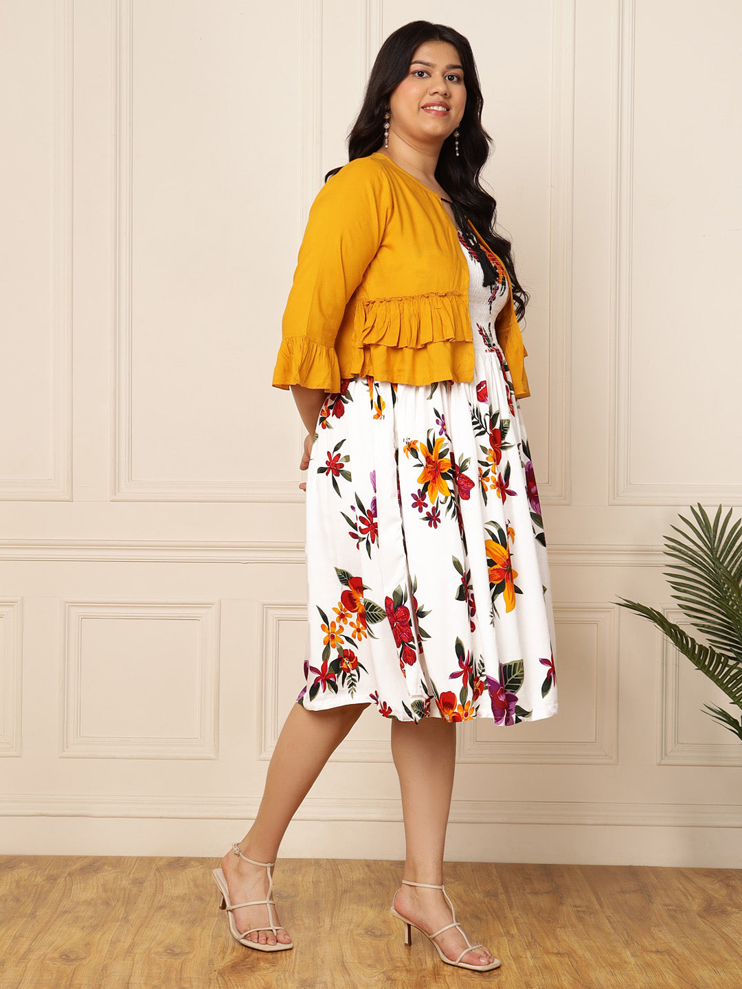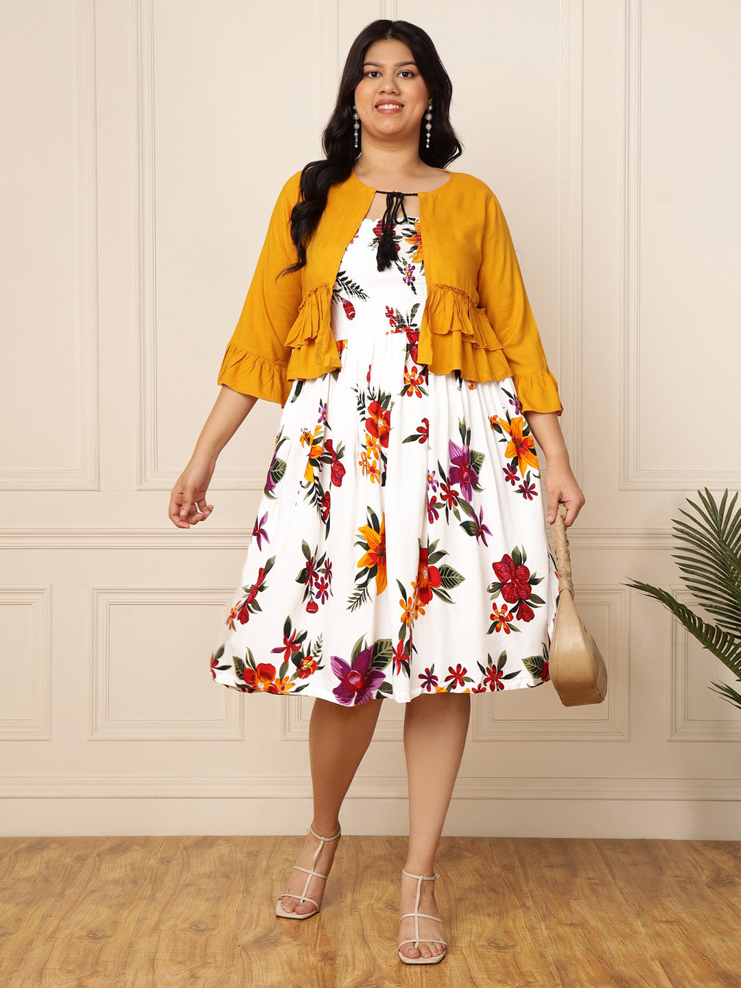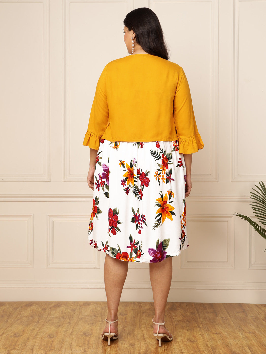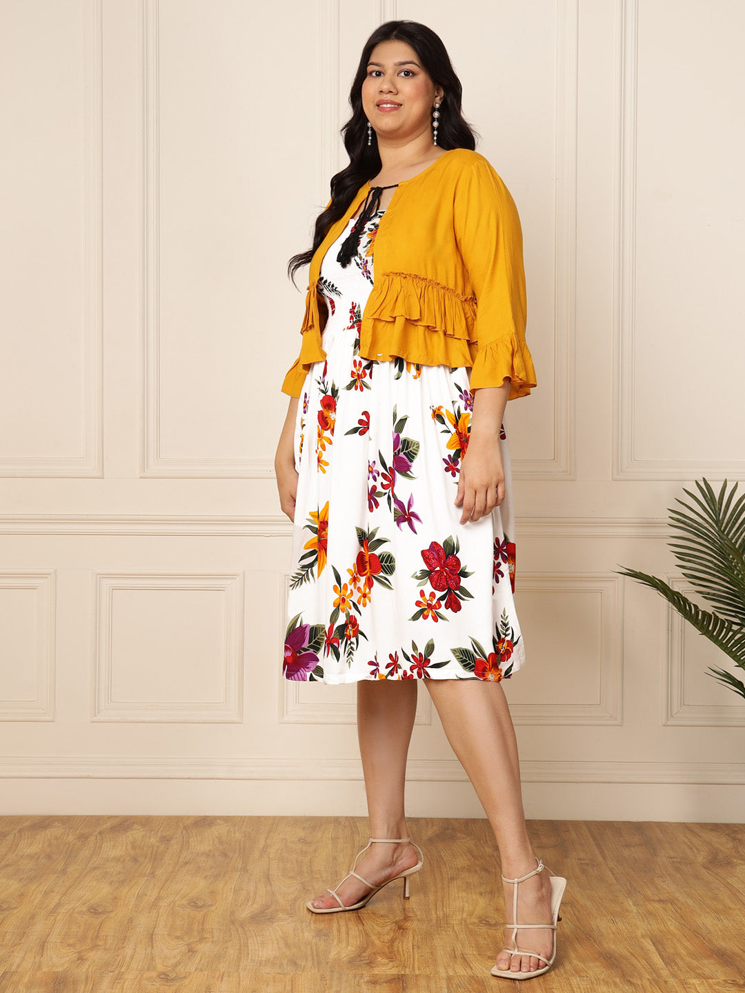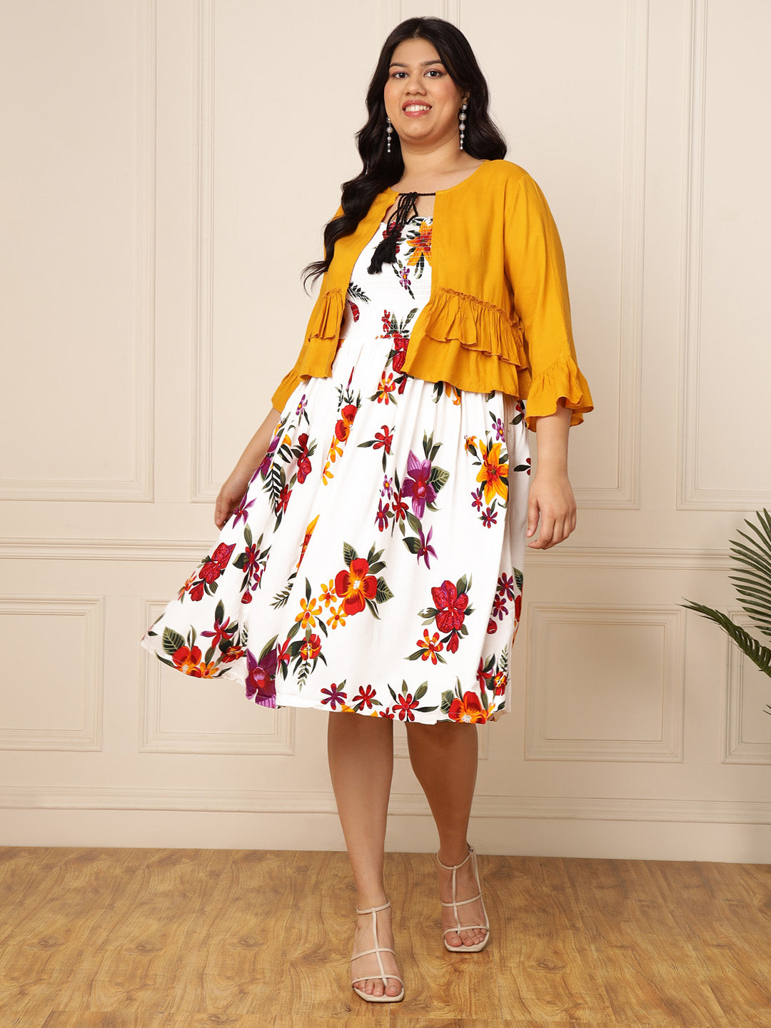 Women's Plus Size White Yellow Floral Tie-Up Neck Fit & Flared Dress