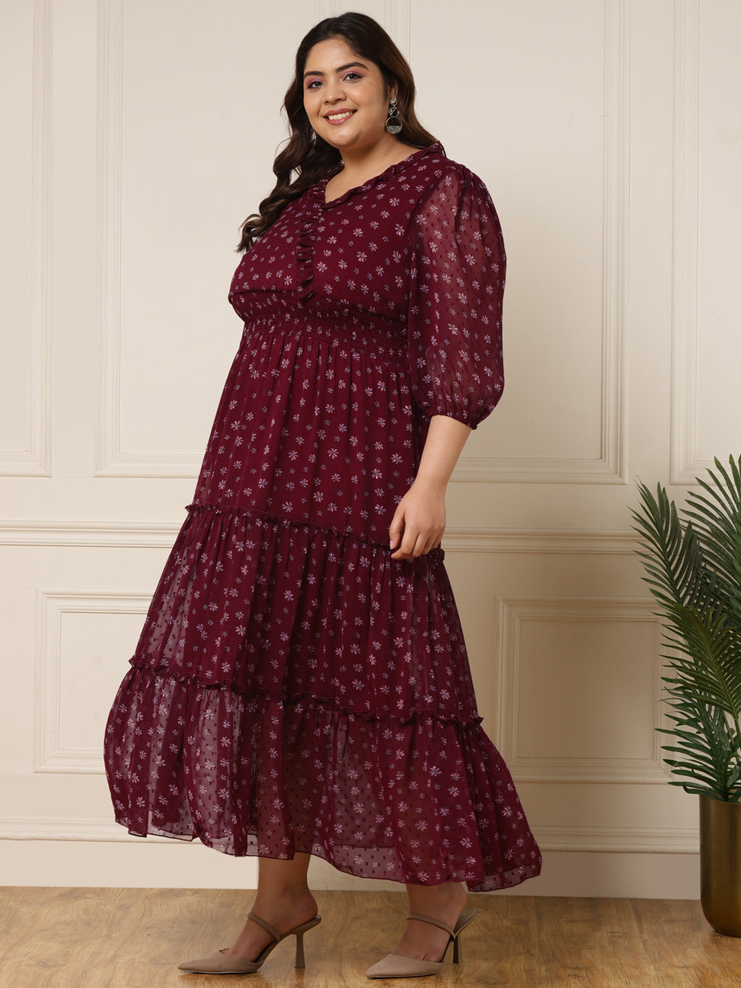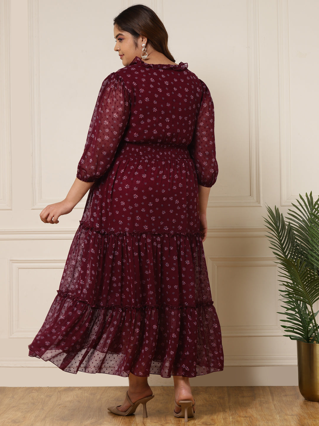 Women's Plus Size WINE DOBBY GEORGETTE TIERED MAXI DRESS